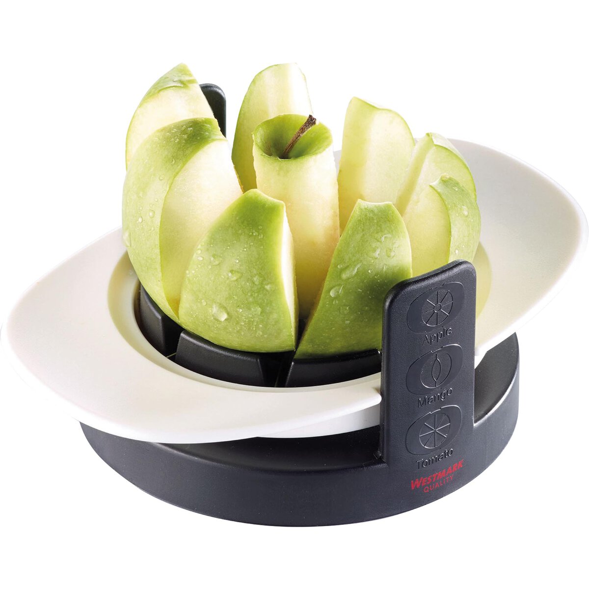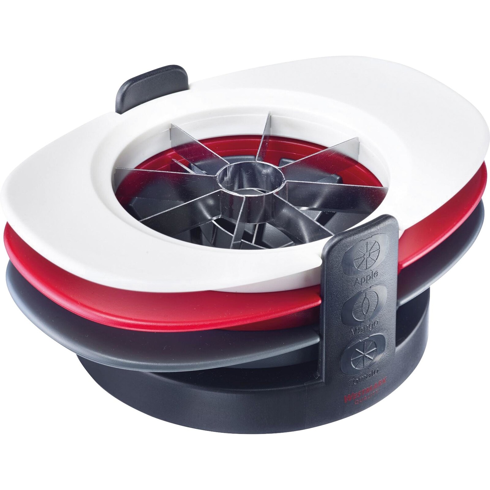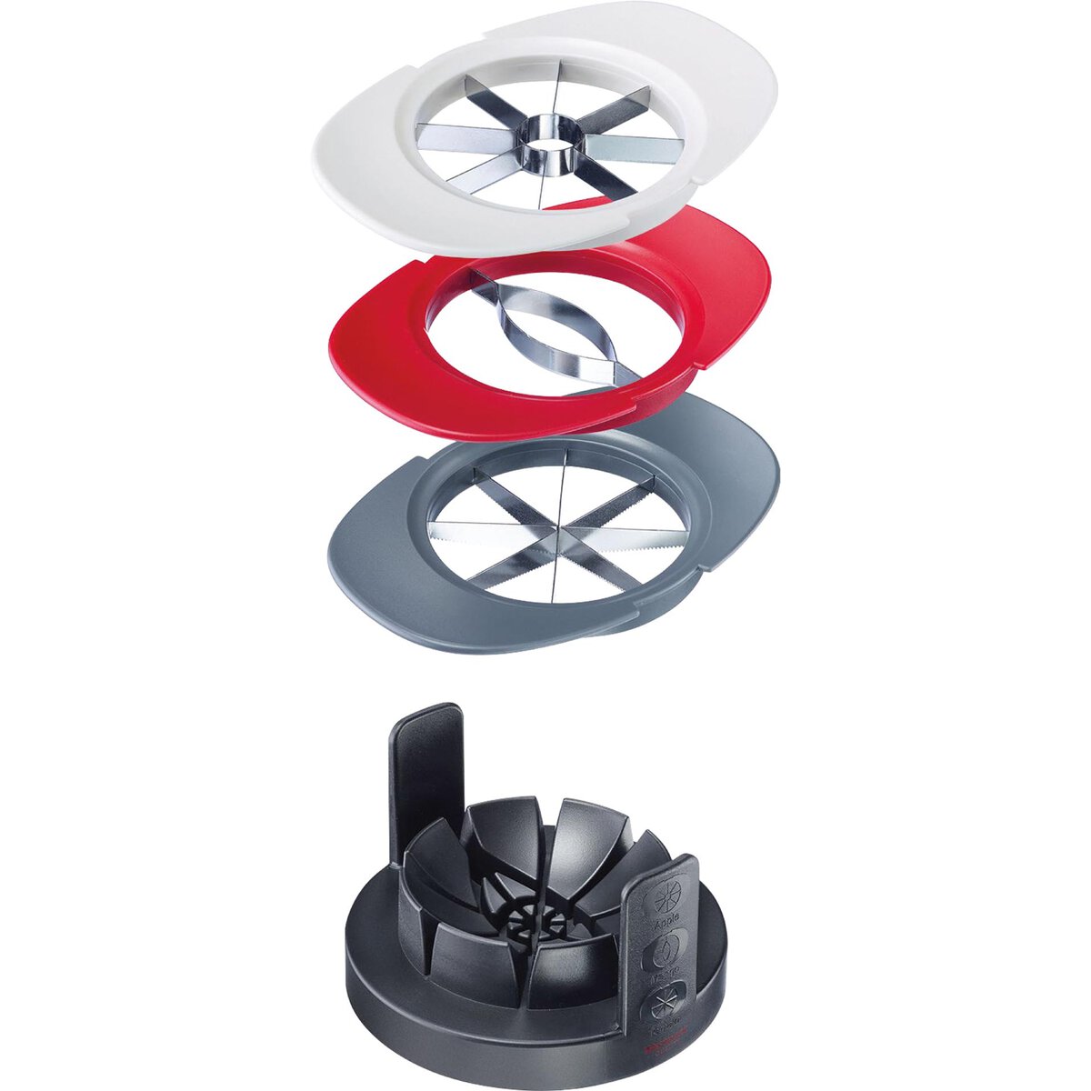 ABS, Edelstahl, platzsparend, 3 unterschiedliche Einsätze zum Teilen und Entkernen von Mangos, Äpfeln und zum Schneiden von Tomaten, scharf geschliffene oder gezackte Edelstahlklingen schneiden sauber durch die Frucht, der passende Untersatz sorgt für das vollständige Durchschneiden in einem Arbeitsgang, spülmaschinengeeignet.