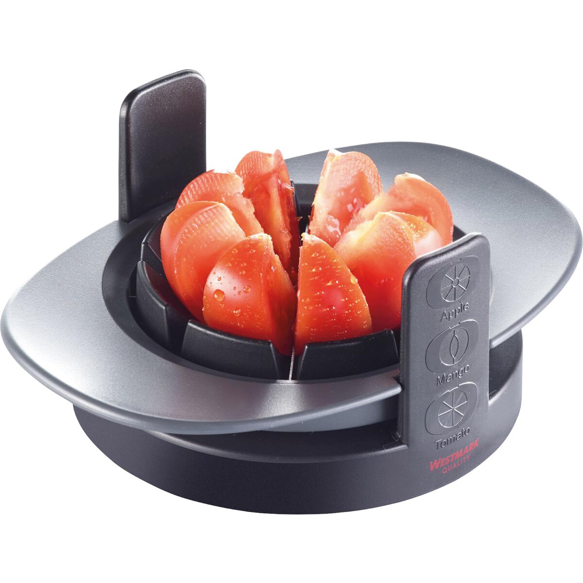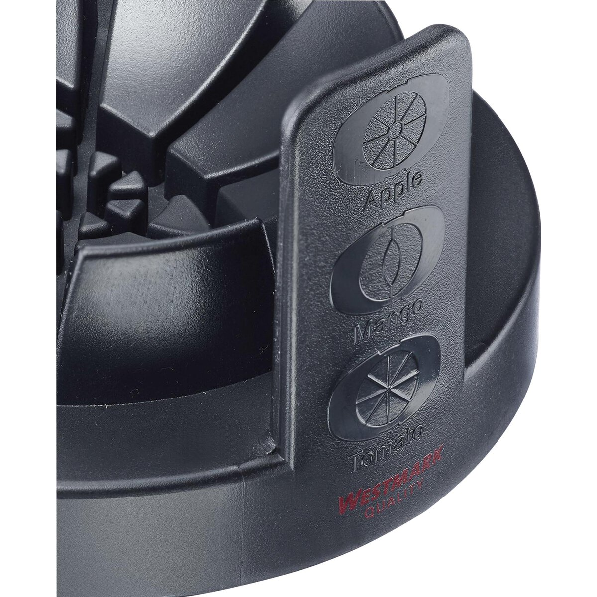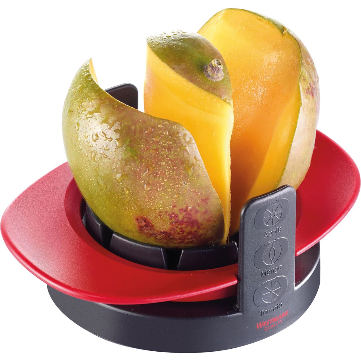 ABS, Edelstahl, platzsparend, 3 unterschiedliche Einsätze zum Teilen und Entkernen von Mangos, Äpfeln und zum Schneiden von Tomaten, scharf geschliffene oder gezackte Edelstahlklingen schneiden sauber durch die Frucht, der passende Untersatz sorgt für das vollständige Durchschneiden in einem Arbeitsgang, spülmaschinengeeignet.