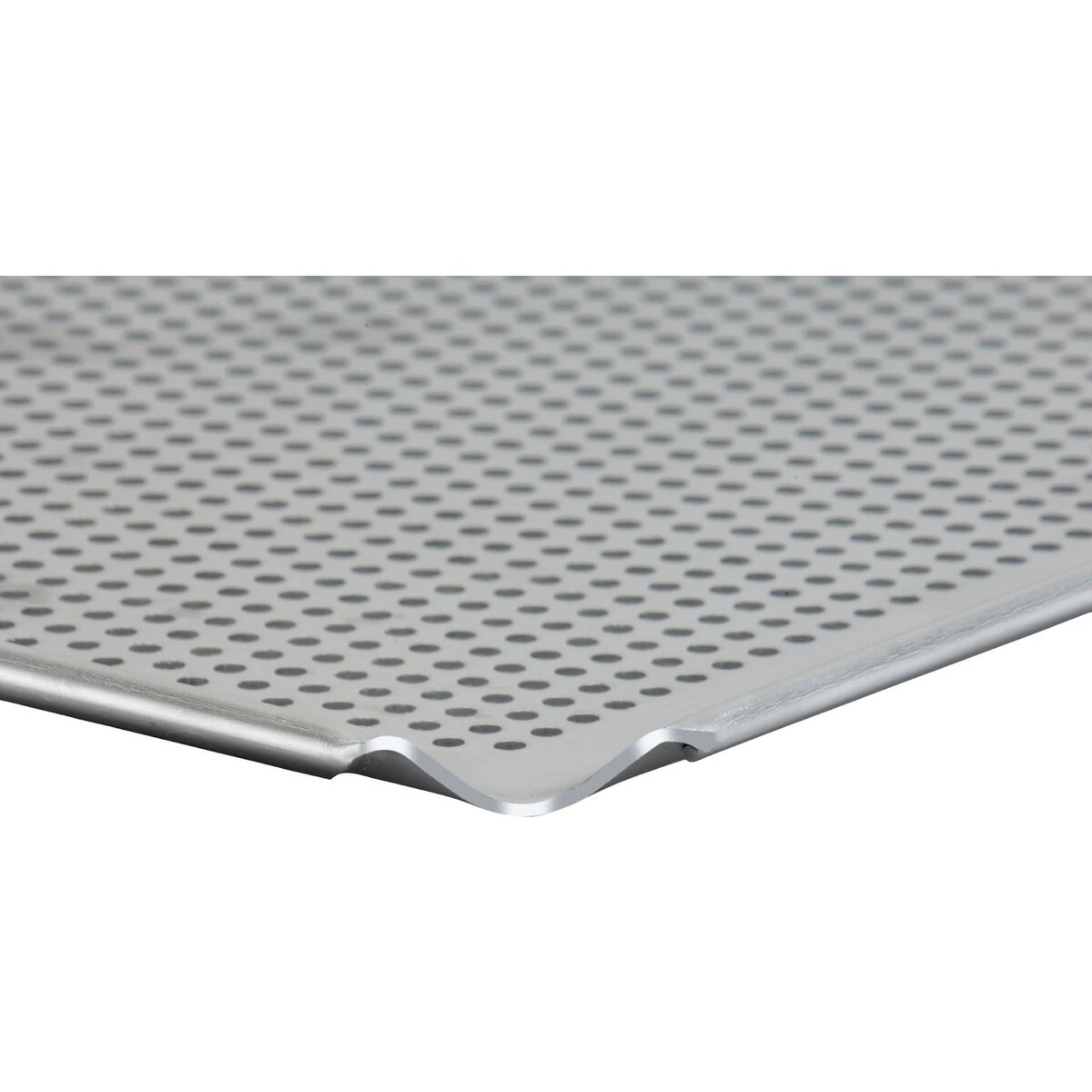 Aluminium. Lochung: 3 mm. Materialstärke: 1,5 mm. 4 Seiten 45°. Profi Bäckerblech. Die Lochung verbessert die Heißluftzirkulation und beschleunigt die Backzeit um 2 bis 3 Minuten. Ideal auch für Halbfertigerzeugnisse oder zum schnellen Aufbacken.