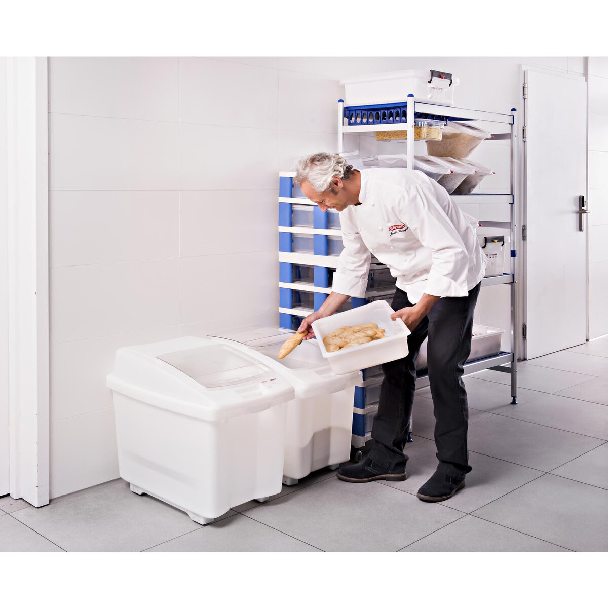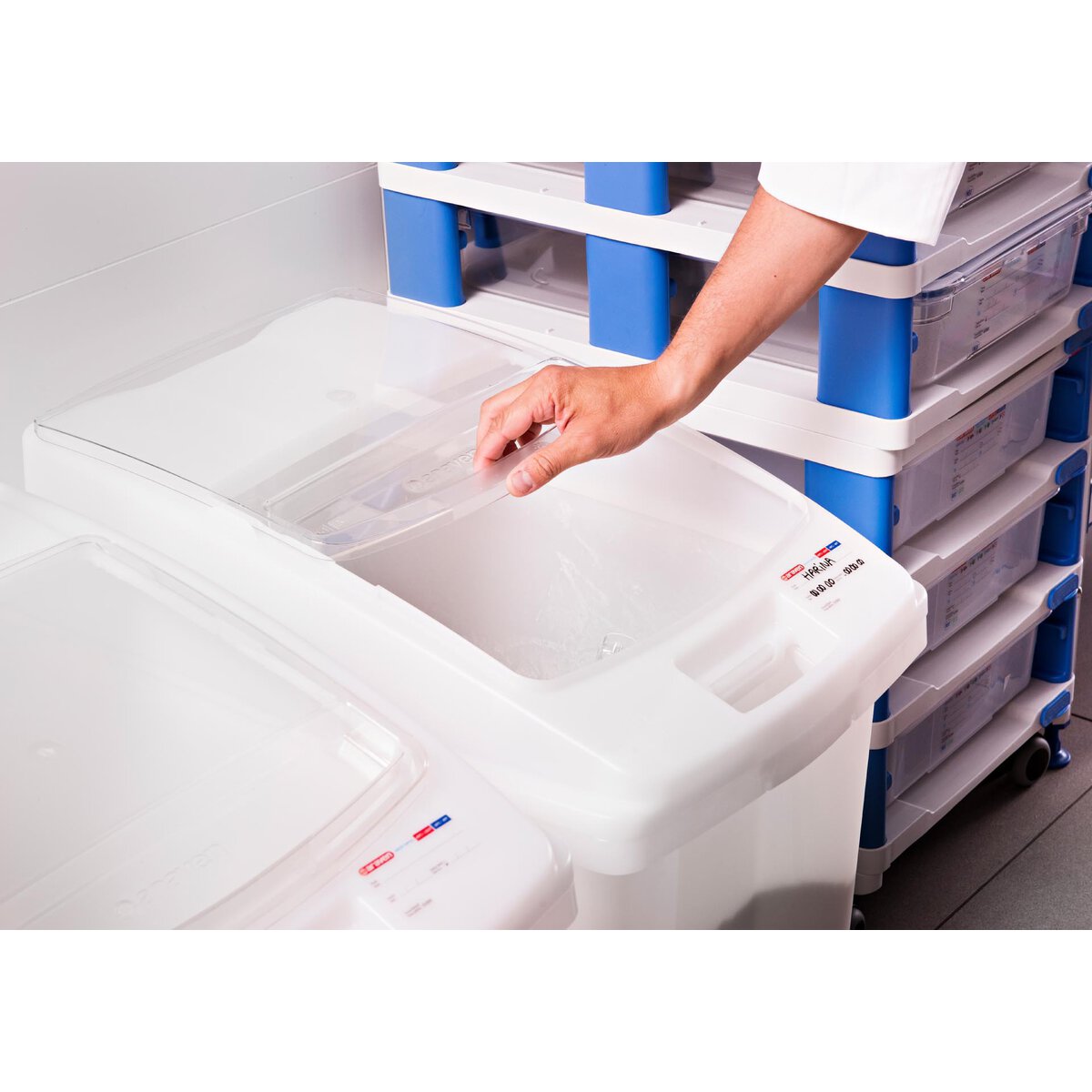 HDPE-Hart-Polyethylen, transparent. Aufgedrucktes Etikett zum Beschriften mit Stift Art.-Nr. 146700. Einfache Befüllung und Entnahme mit Schaufel Art.-Nr. 11601 + 11602. Deckel als Sichtfenster und mit Schnappverschluss. Mit seitlichen Griffen für einfache Handhabung & Transport. Abgerundete Kanten. Spülmaschinengeeignet.