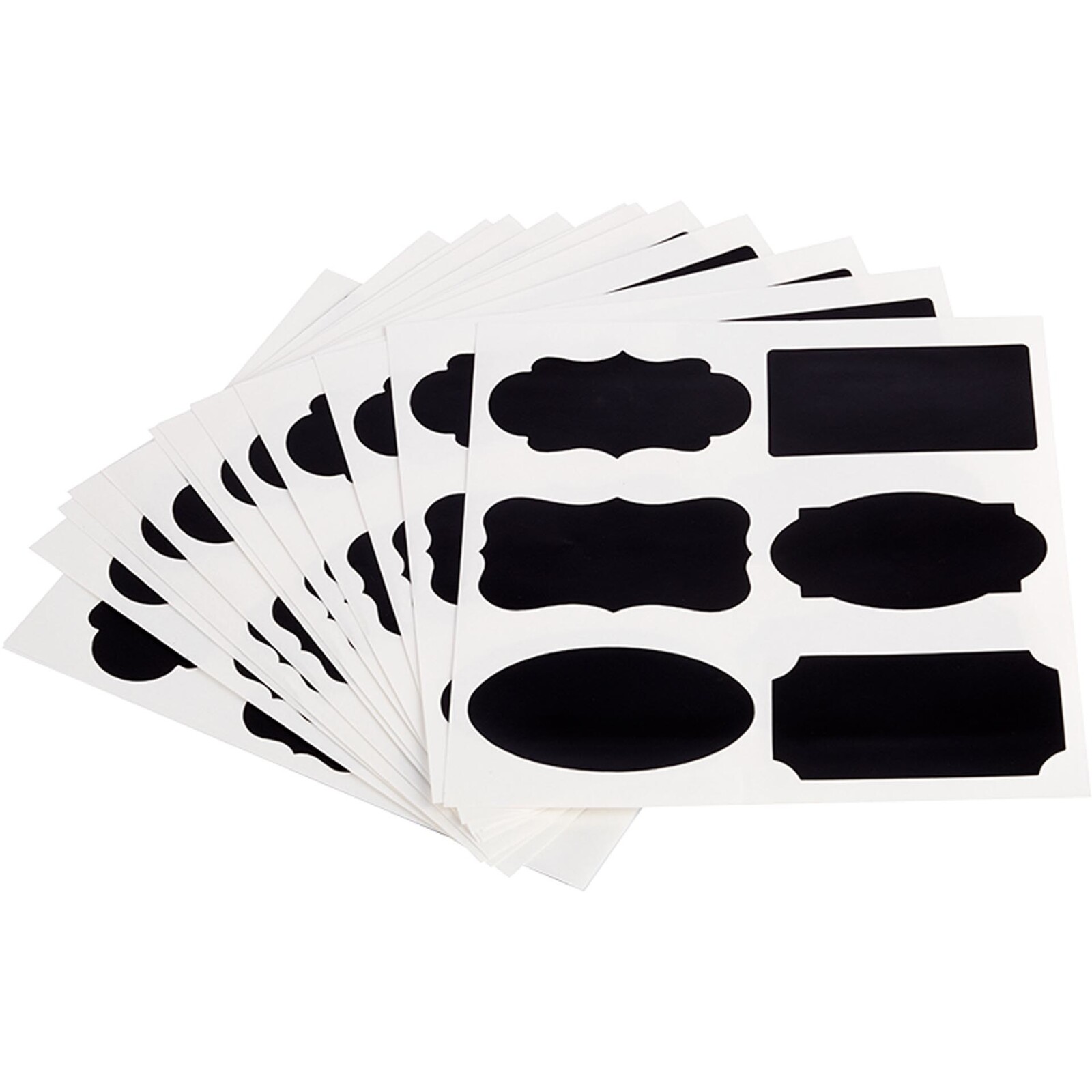 Schwarz, PVC, 12 Bögen á 6 Motive, selbstklebend, individuell mit wasserlöslichem Stift (Kreide-Marker) beschreibbar, abwaschbar, leicht ablösbar, vielseitig einsetzbar, wiederverwendbar, 72er Pack.