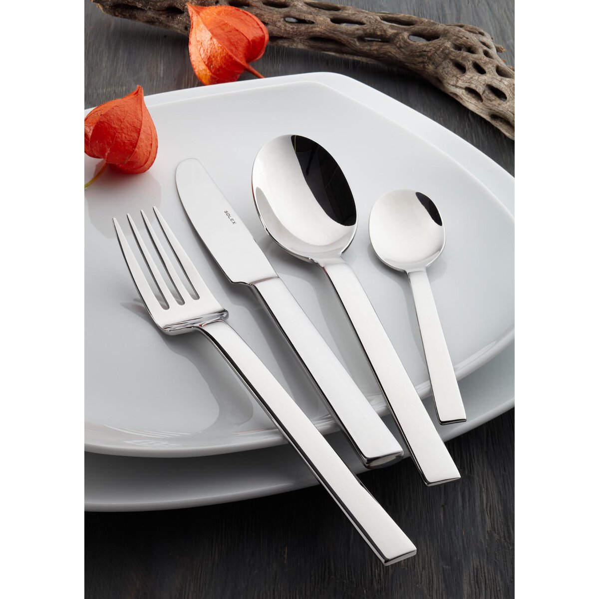 Chrom-Nickel-Stahl 18/10, rostfrei, poliert. Messer mit geschmiedeter Klinge. 2,8 mm stark. Qualitätsbesteck. Hohe Stabilität.