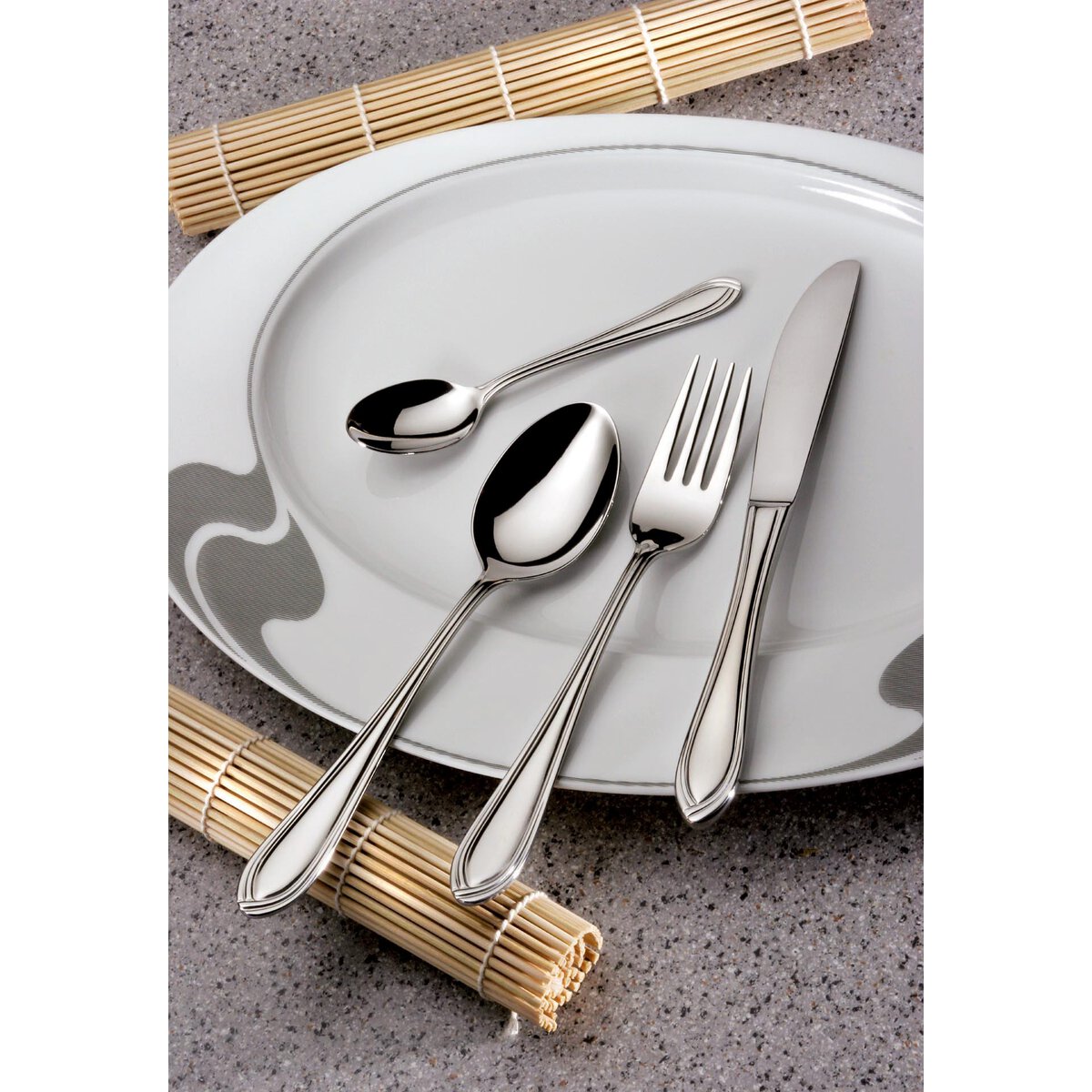 Chrom-Nickel-Stahl 18/10, rostfrei, poliert. Messer mit geschmiedeter Klinge. 2,5 mm stark. Qualitätsbesteck.