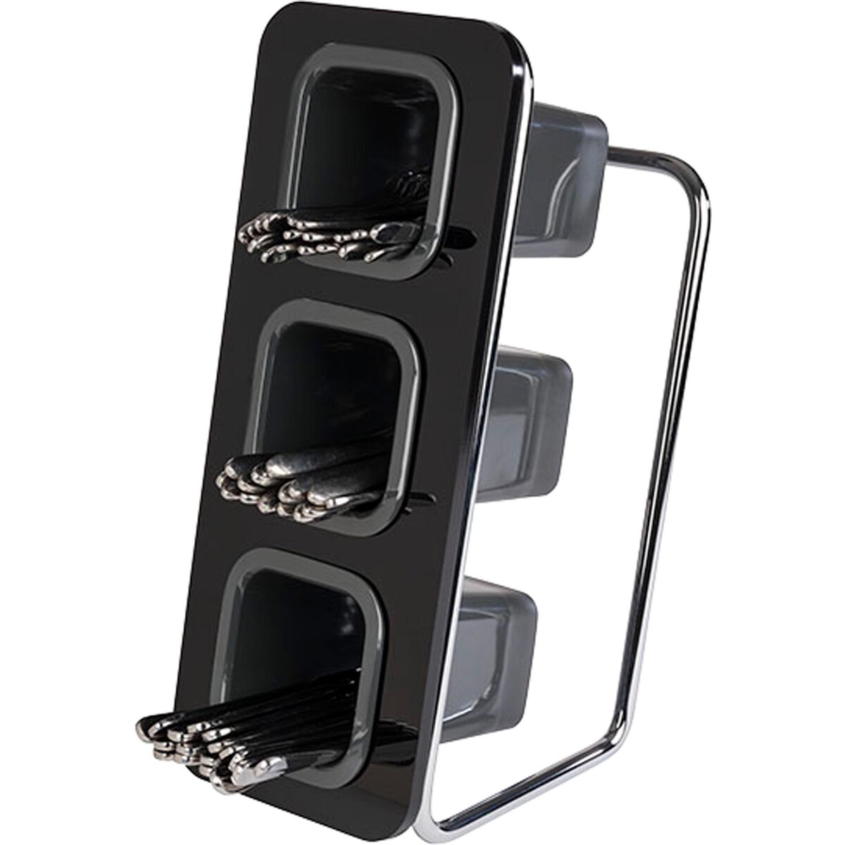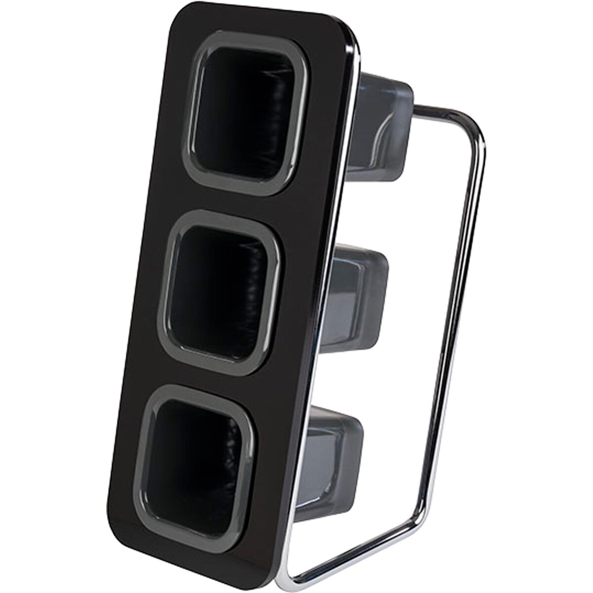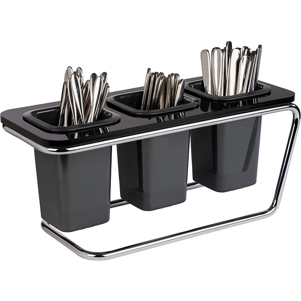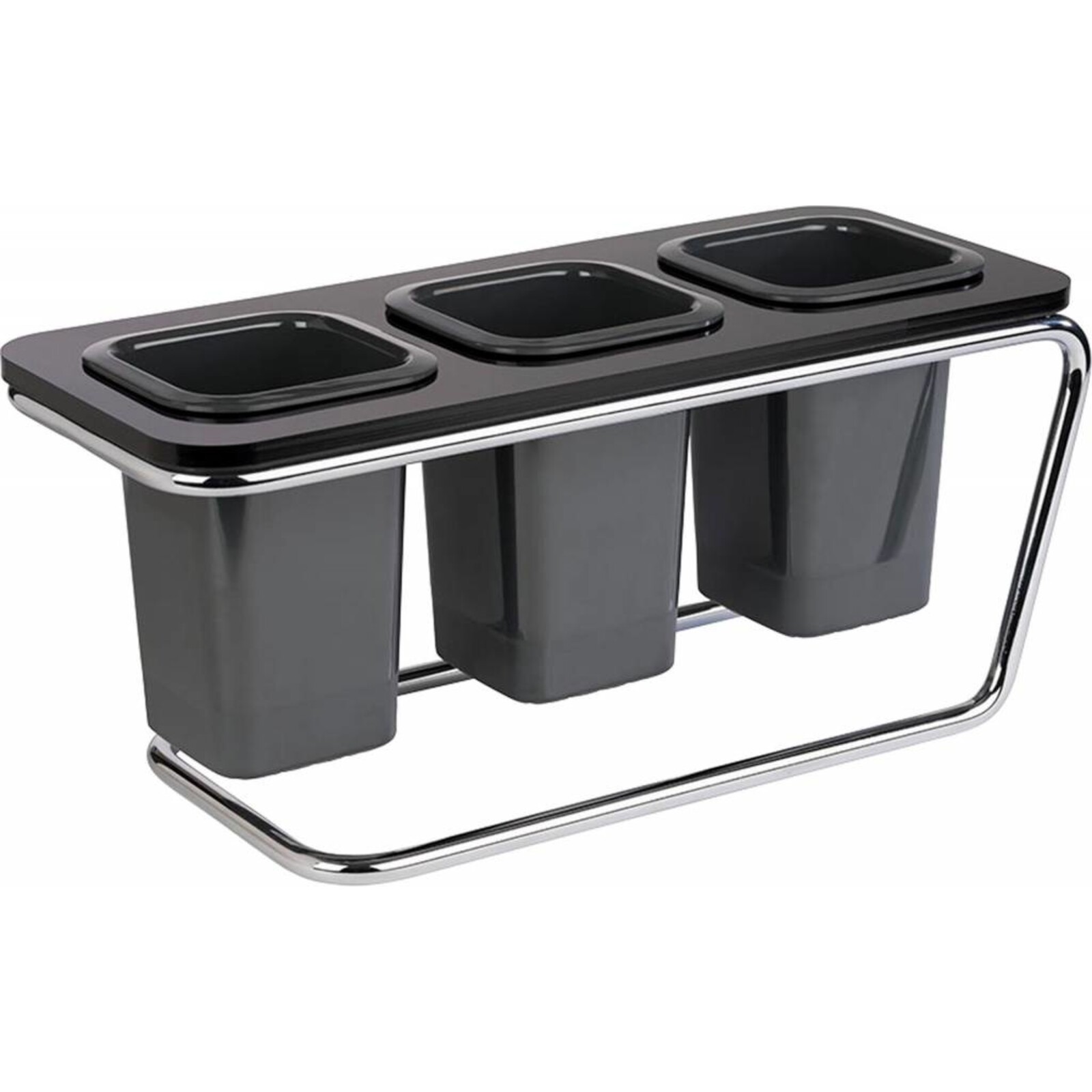 Gestell aus verchromtem Metall, Rahmen aus schwarzem Acryl, Besteckköcher (3 Stück inkl., mit Abflusslöchern, Spülmaschinengeeignet) aus anthrazitfarbenem Melamin, waagerechte als auch senkrechte Nutzungsmöglichkeit, platzsparend, stabile Ausführung.
