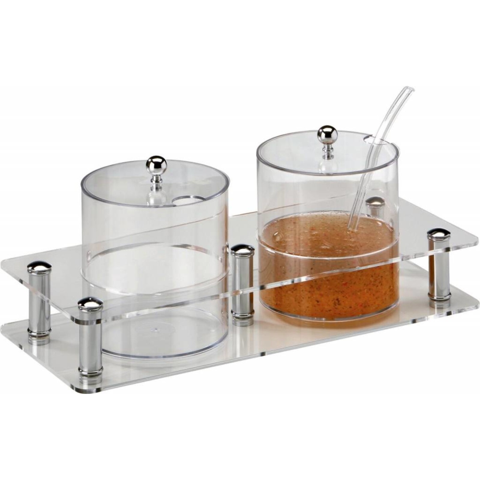 Acryl mit Edelstahl, mit 2 oder 3 Behältern erhältlich, mit Behälter und Deckel, ØxH in cm: 15x16. Ergänzung mit Kühleinsatz für Eiswürfel möglich.