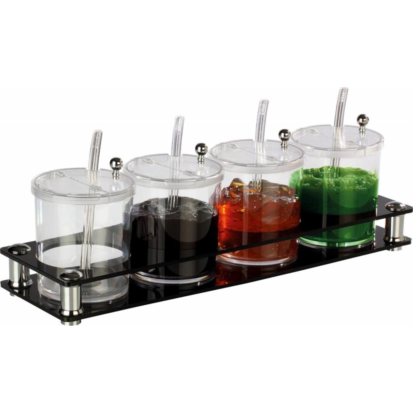 Unterteil schwarzes Acryl. Zwischenstück verchromtes ABS. Behälter Polycarbonat transparent à 0,75 l inkl. klappbarem Deckel mit Metallknopf silber. Behältergröße: ØxH in cm: 11x12. Ohne Löffel.