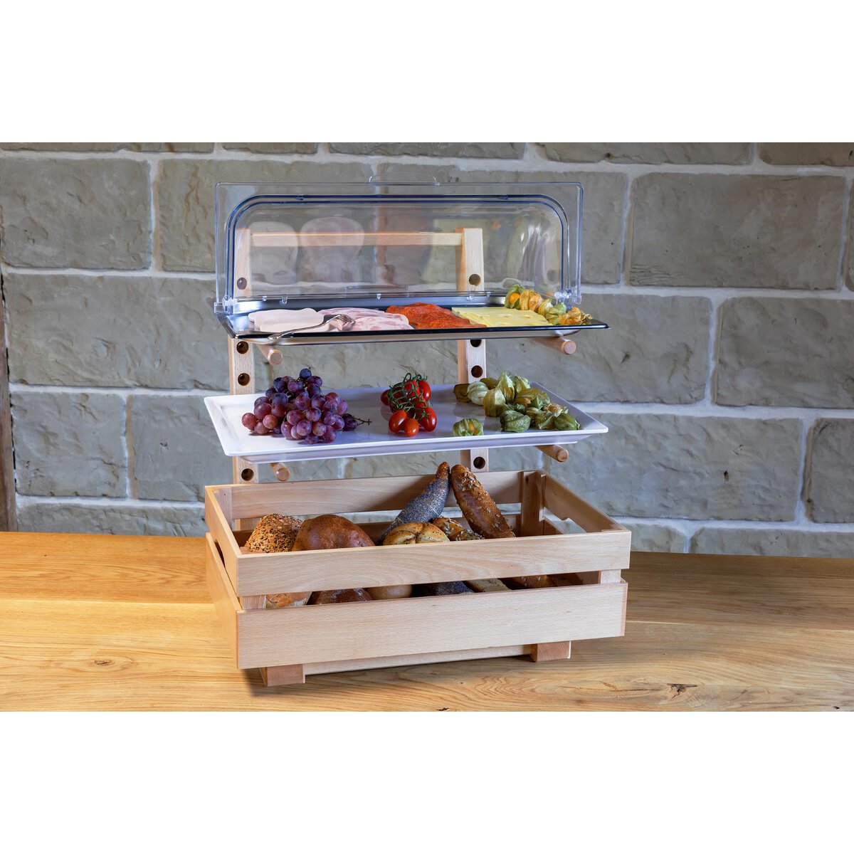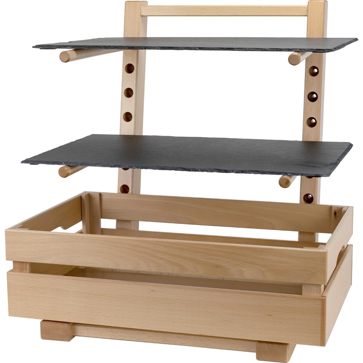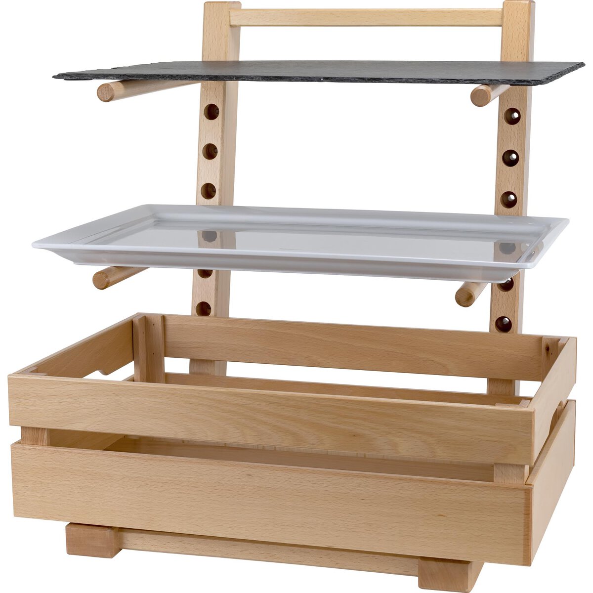 Buffetständer aus Buchenholz. Lebensmittelecht versiegelt um Verschmutzung zu verhindern und eine bessere Reinigung zu gewährleisten. Nicht spülmaschinengeeignet! Lieferumfang: Ständer, vier Rundhölzer und Befestigungschrauben. LxBxH: 43,5x46x58cm. Maße der Stäbe: Ø 1,8cm, Länge 38cm. Hierzu passende Box (Art.: 15256) separat erhältlich.