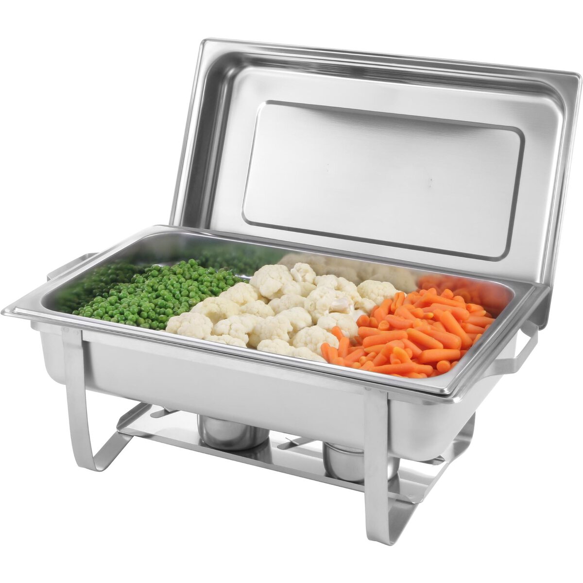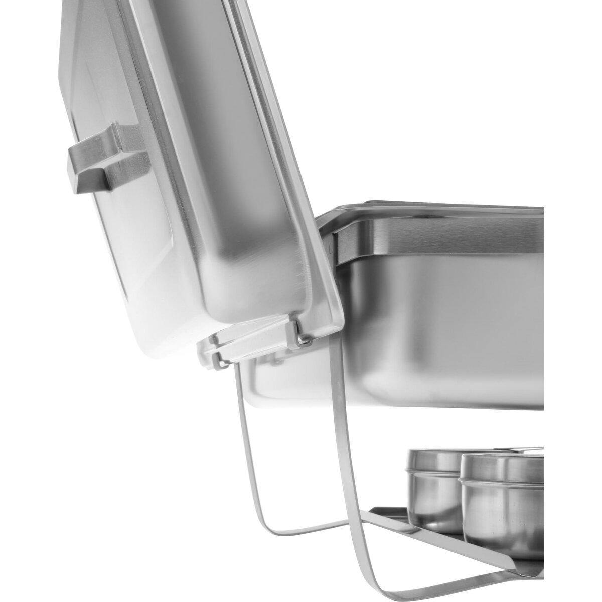 Edelstahl: 18/0, Inhalt: 9 Liter. Mit jeweils einem hochglanzpoliertem, einsteckbarem Deckel, einer GN 1/1 Lebensmittelpfanne, 65 mm tief und 2 Brennpastenbehältern. Geeignet für Gastronorm Behälter bis 65 mm tief.