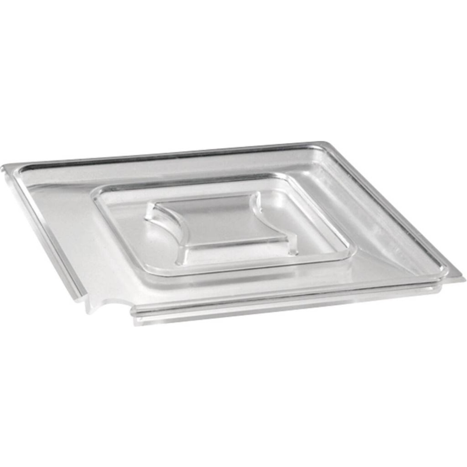 Kunststoff, transparent mit Löffelaussparung, stapelbar, Spülmaschinengeeignet.