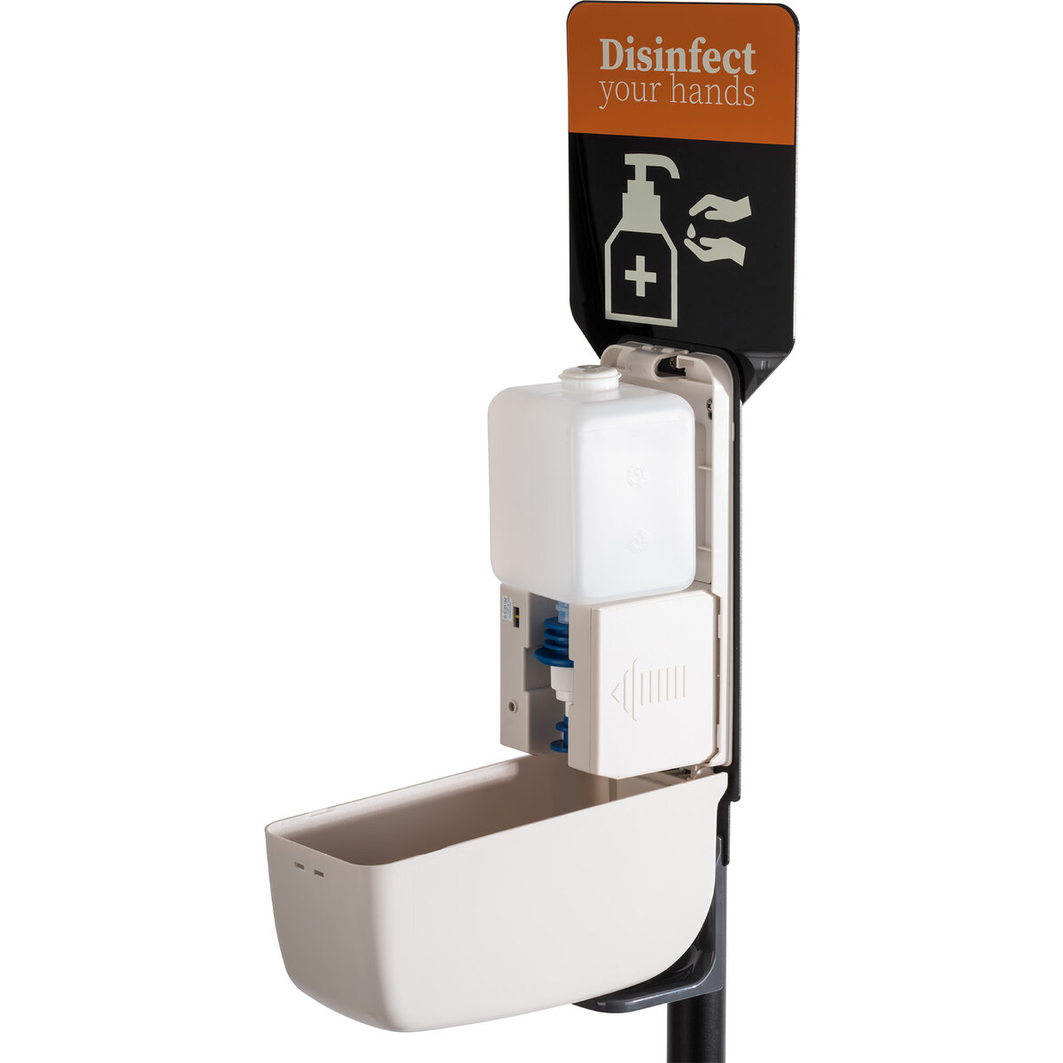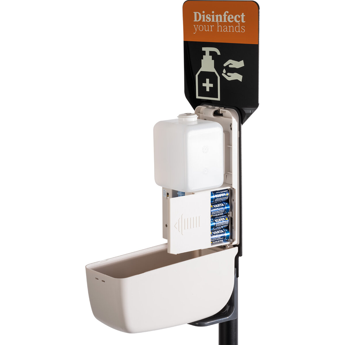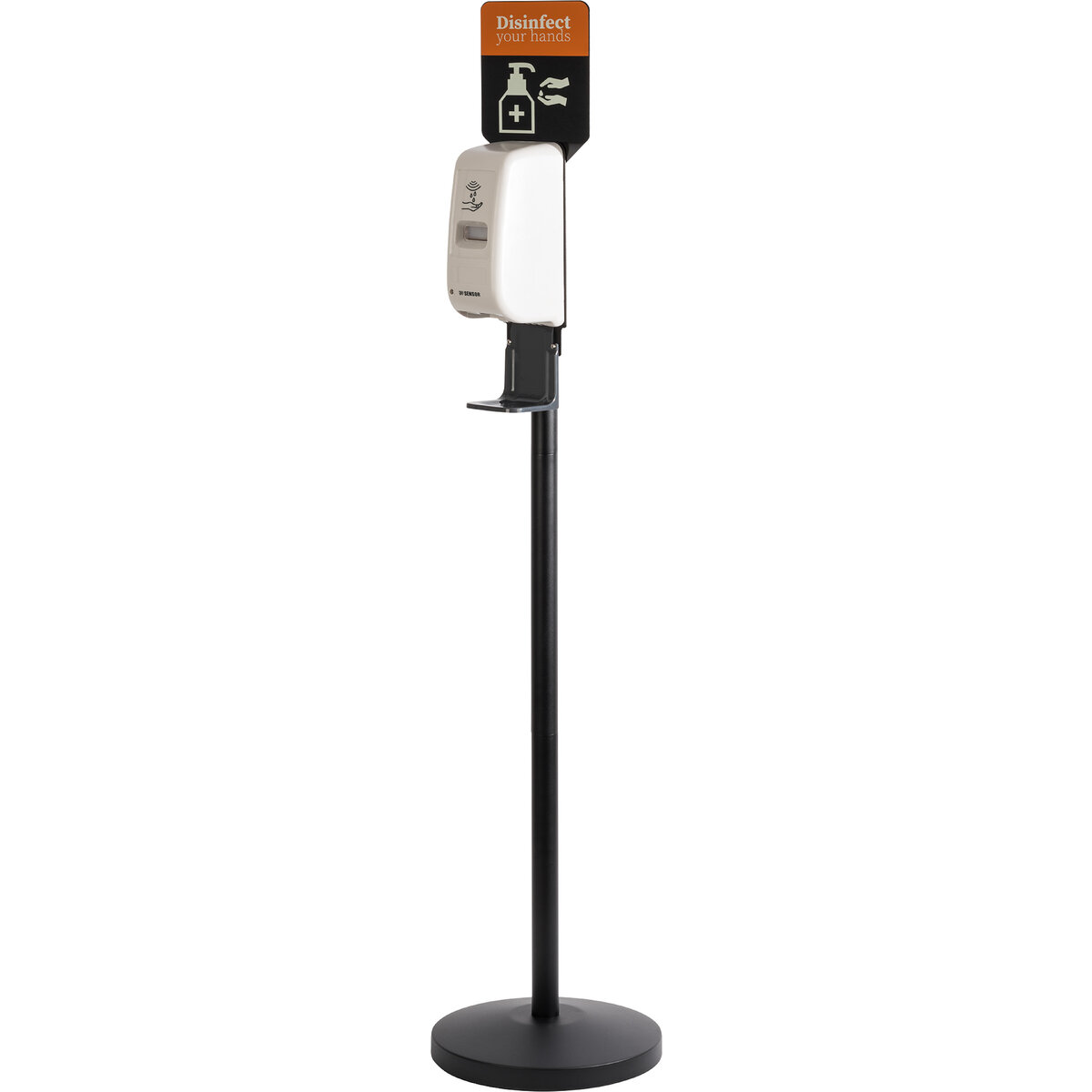 Desinfektionsständer zur berührungslosen Handdesinfektion. Metall, schwarz, Kunststoff mit Sensor, schwerer Standfuß Ø 32 cm, inkl. Informationstafel, Fassungsvermögen: ca. 1 Liter. Nicht enthalten: Desinfektionsmittel und Batterien (benötigt werden 4 Stk. Typ C-LR14).