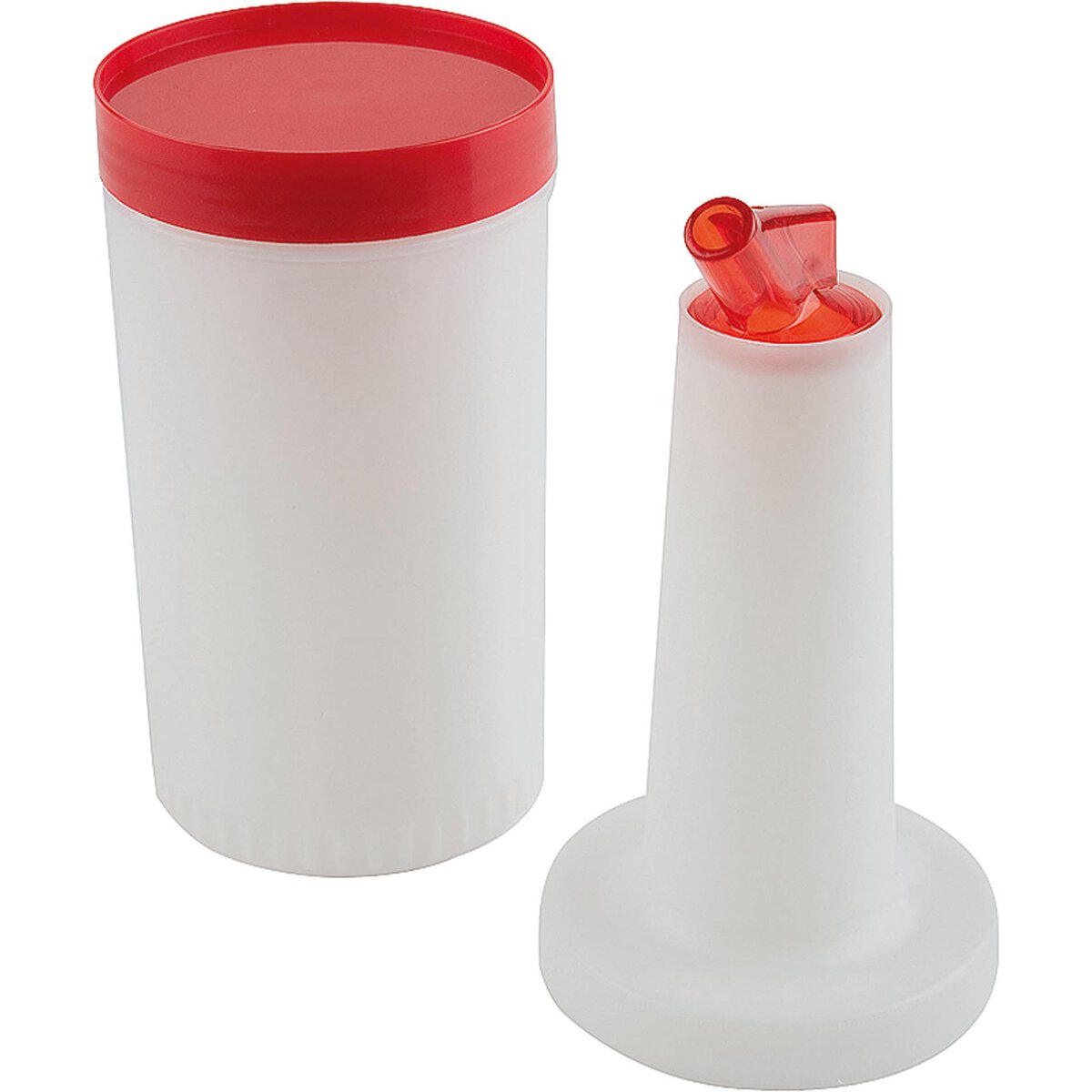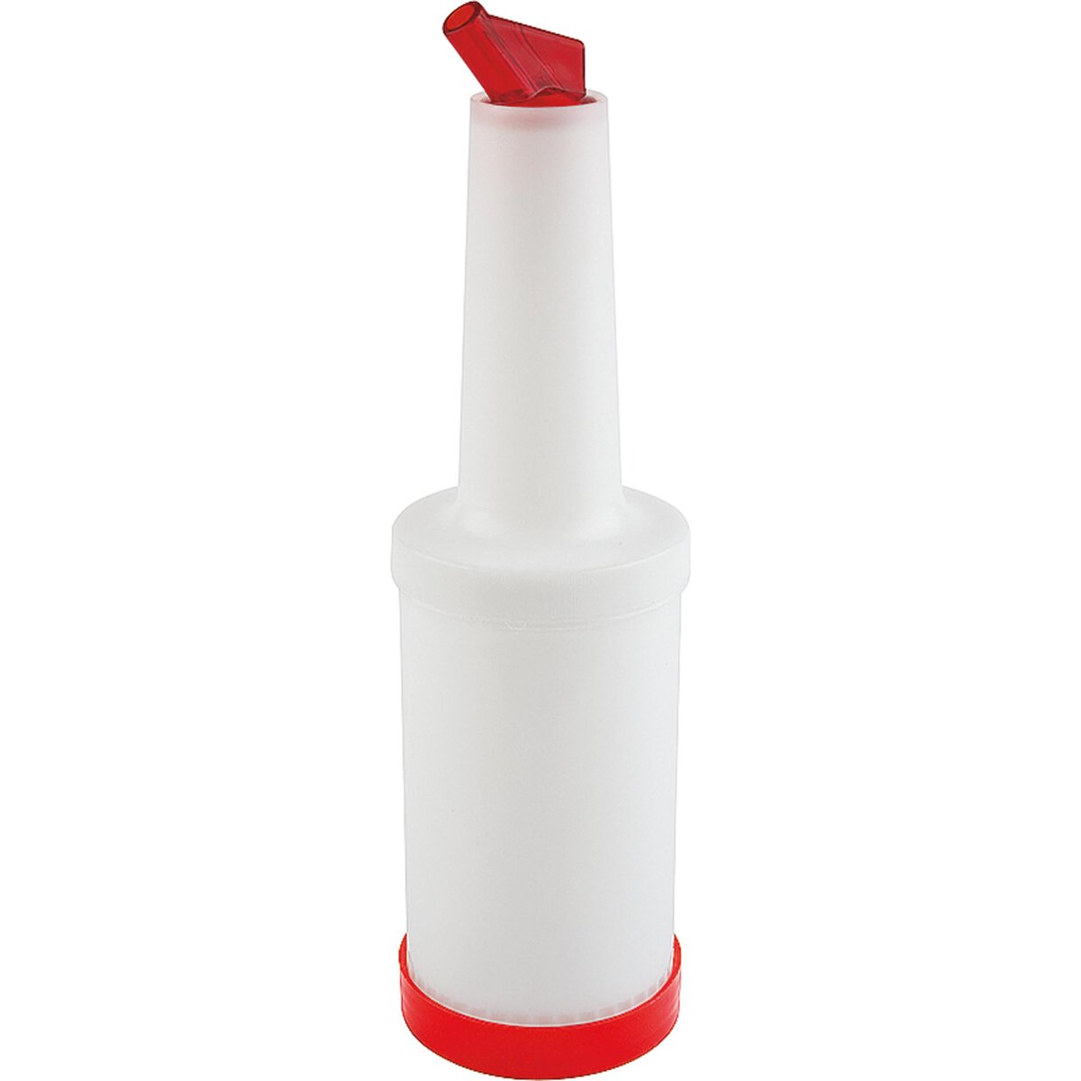 4-tlg. Behälter + Flaschenhals + Schraubdeckel + Ausgießer Ø 11mm mit Luftzufuhr für gezieltes Ausgießen, zum Dosieren und Aufbewahren. Polyethylen. Inhalt: ca. 1 Liter.