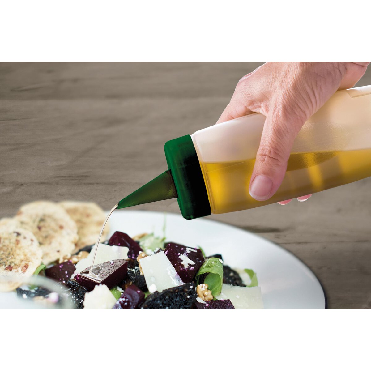Speziell für Öle, Dressings, Sojasauce, Teriyaki, leichte Dressings, Saucen mit geringer Dichte. Die überschüssige Flüssigkeit, die durch die Düse abfließt, gelangt durch das im Deckel vorgesehene Loch in das Innere der Flasche zurück (Rücklaufsystem). Dieses Loch reguliert wiederum den Tropfenfluss bei der Abgabe. Inkl. Verschlusskappe. Deckel mit Schraubverschluss. Extra Feld für Beschriftung, sowie Datierung. Beidseitig, gespiegelte Skala in ml und oz. Einfache Reinigung. Leichte Befüllung durch große Öffnung. Ergonomischer Griff ermöglicht die Steuerung des Durchflusses durch den ausgeübten Druck. Polyethylen (LDPE): weißliches Aussehen, ohne Farbstoffe, sehr flexibel, weich und elastisch, sehr hohe Elastizitätsgrenze, stellt Form nach Verformung wieder her, gute mechanische und optische Eigenschaften. Temperaturbereich -40°C bis +90°C. Spülmaschinengeeignet.