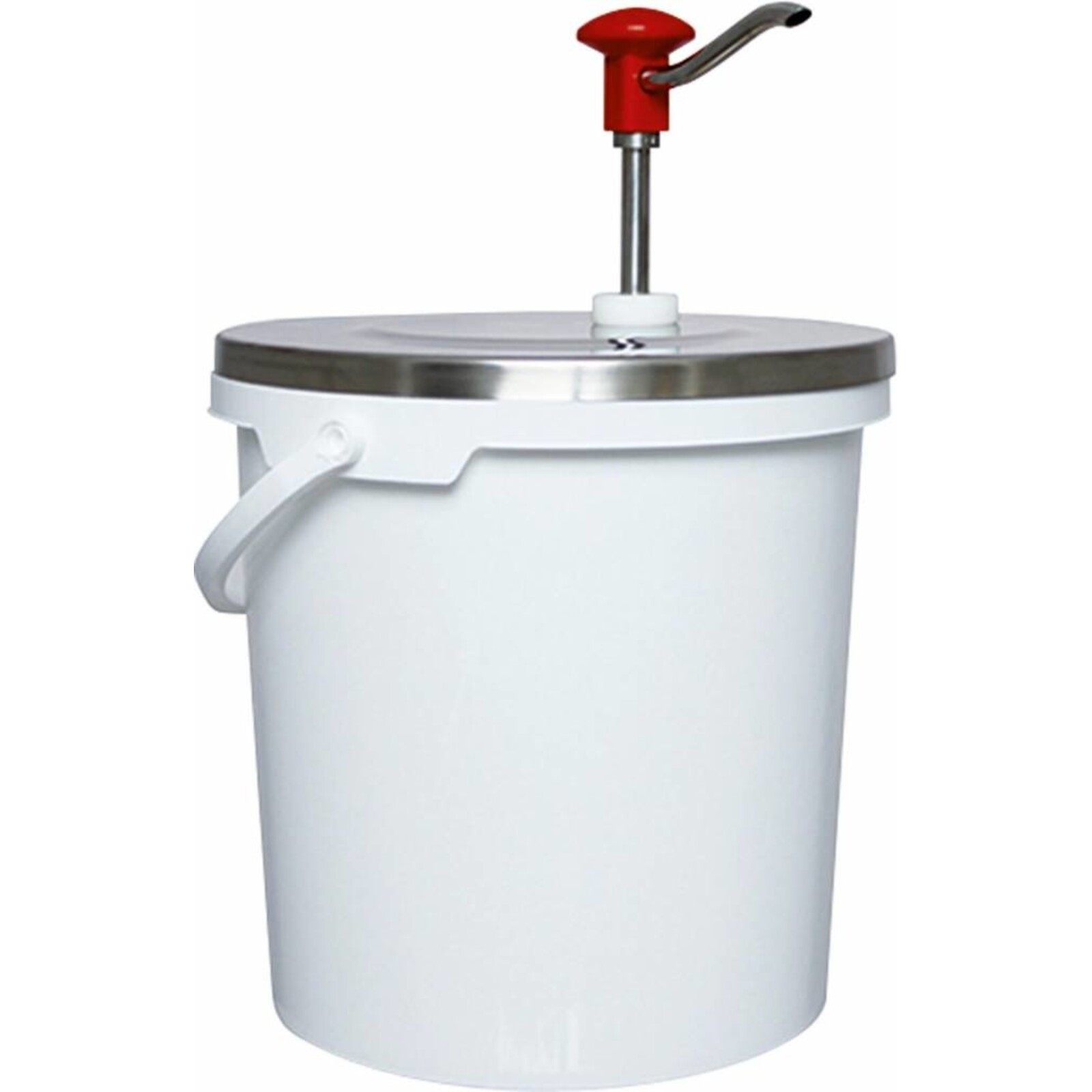 Behälter mit Henkel aus Polypropylen. Deckel aus Edelstahl. Bedienung mittels Druckknopf und einer Dosierung einstellbar bis 30 ml.
