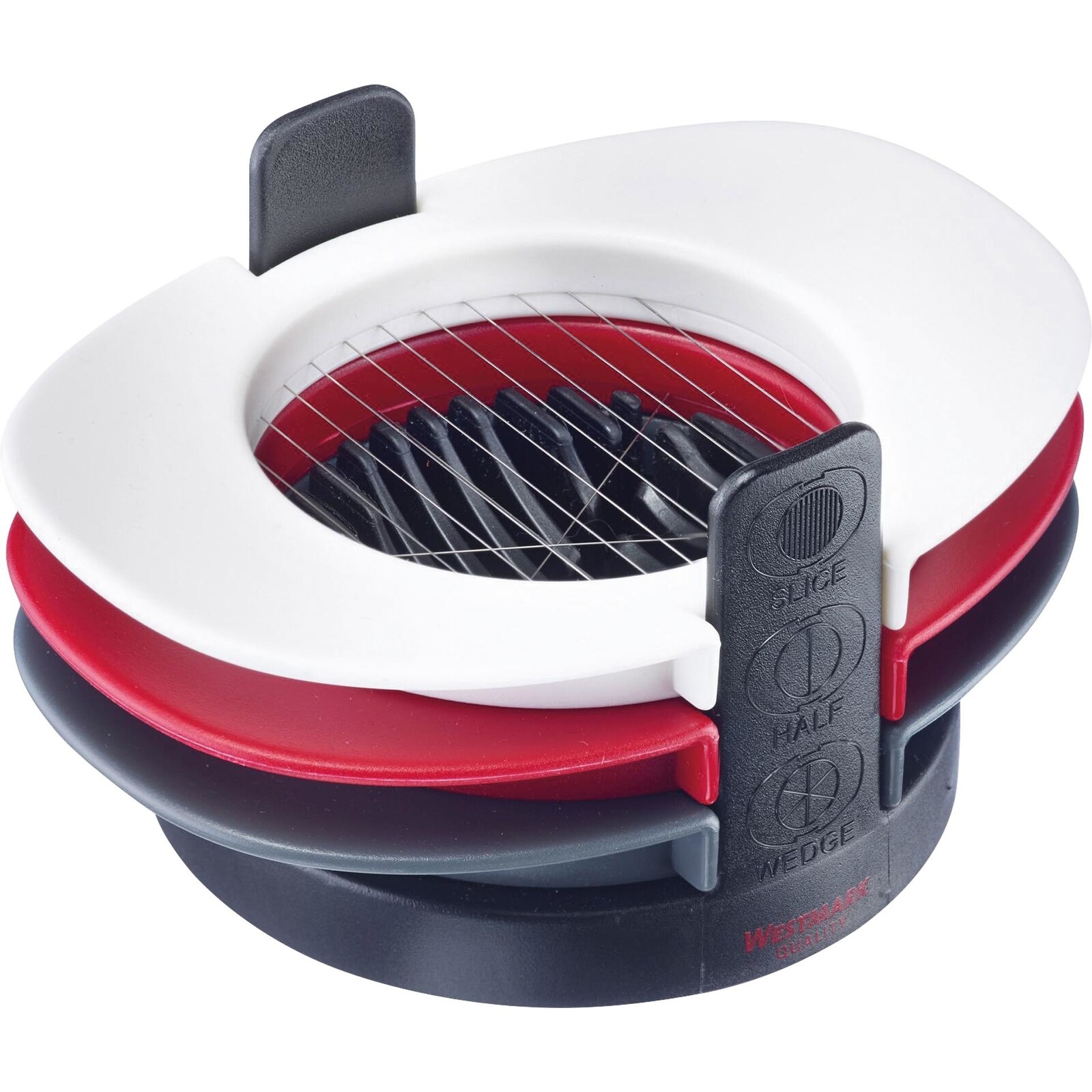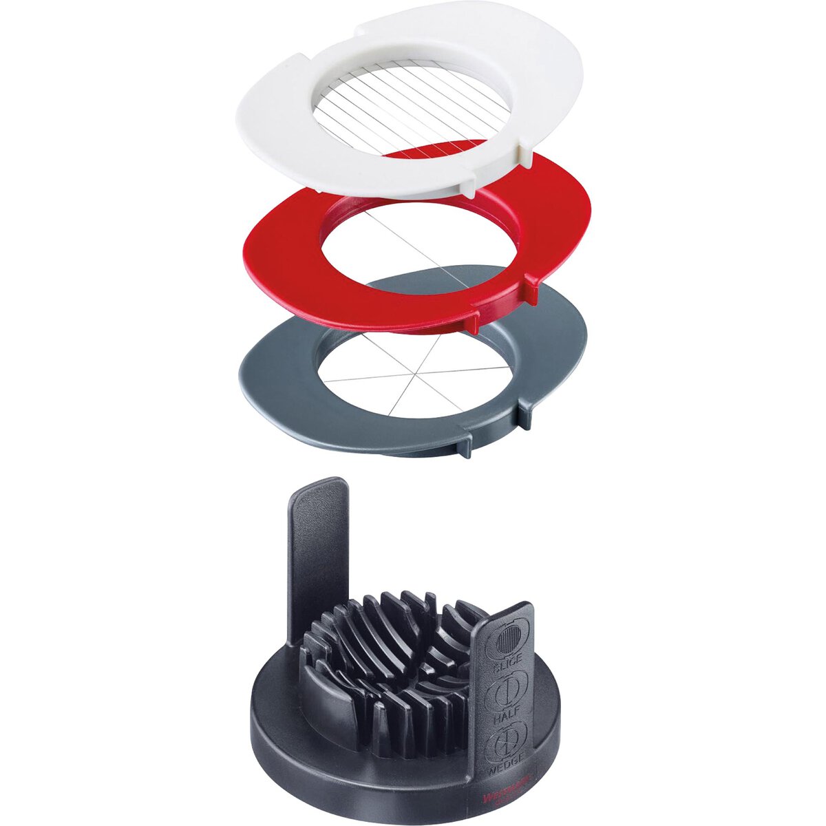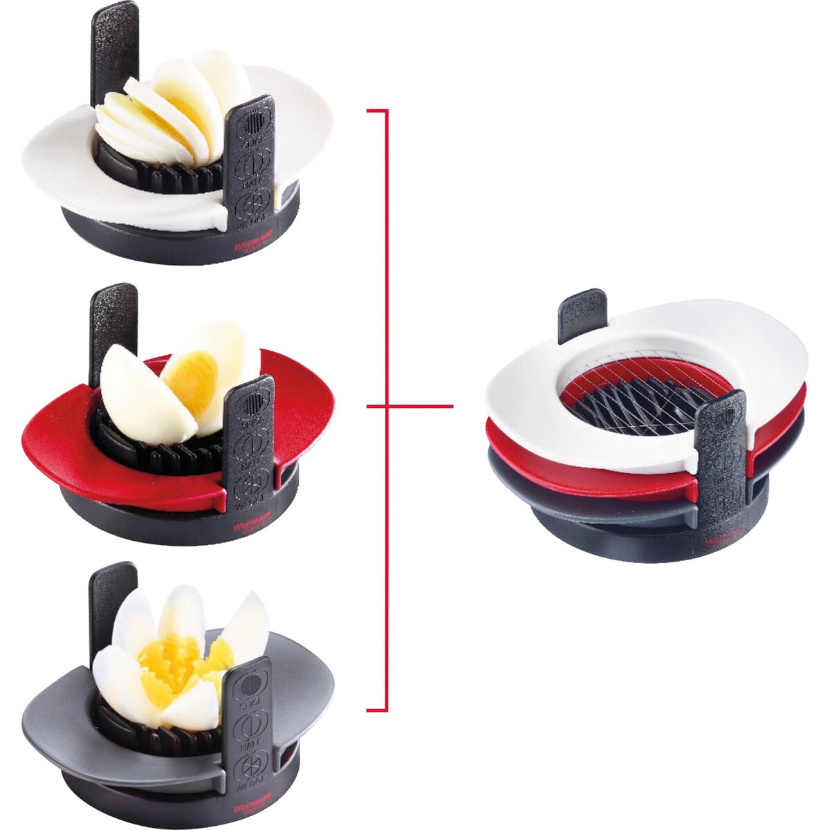 PP, Edelstahl, platzsparend, drei unterschiedliche Einsätze zum Schneiden von hartgekochten Eiern in sechs gleichmäßige Stücke, in Scheiben oder zum Halbieren, für Eier, Pilze, kleine Mozzarellakugeln etc. Der passende Untersatz sorgt für das vollständige Durchschneiden in einem Arbeitsgang. Nicht spülmaschinengeeignet.