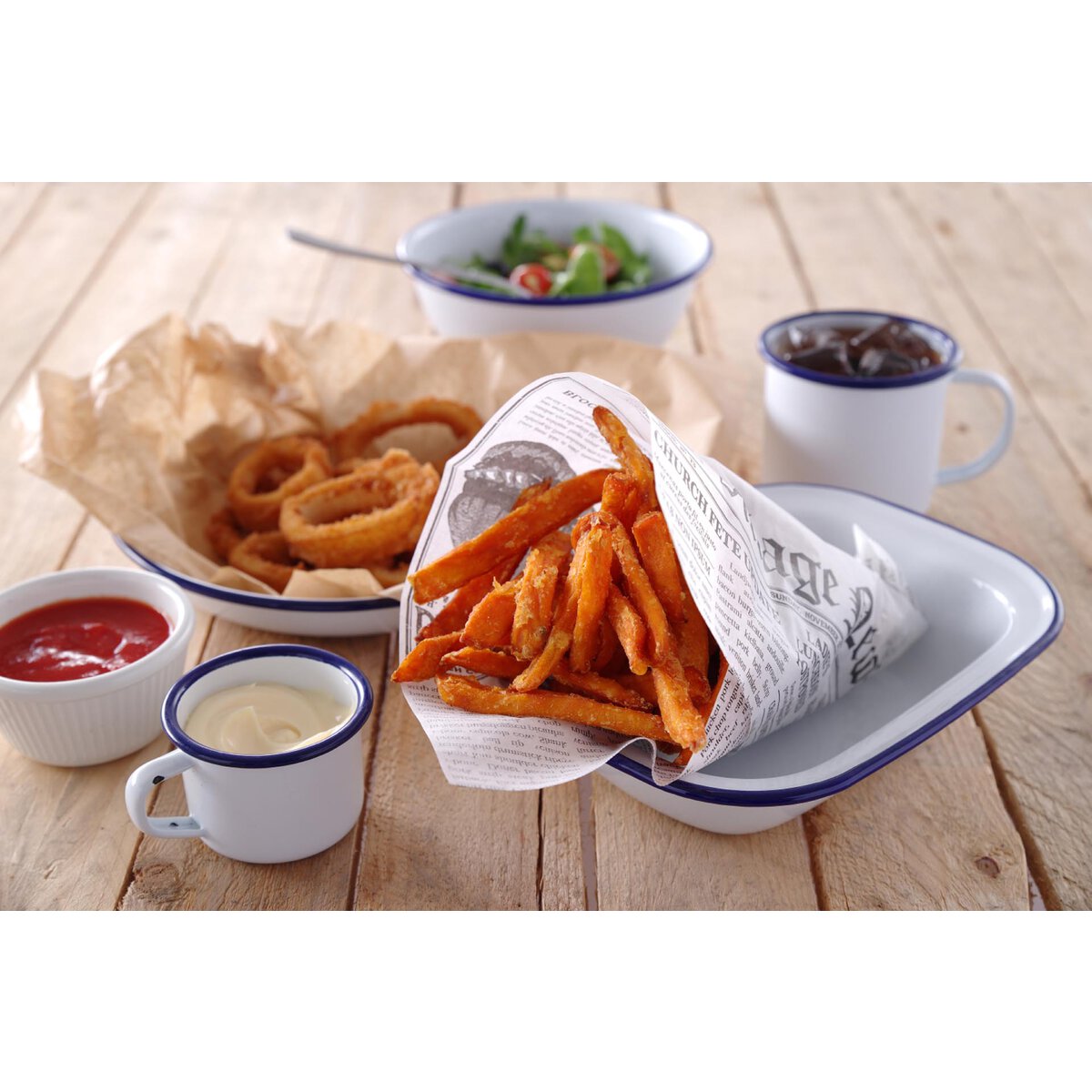 Fettdichtes Einschlagpapier mit "Zeitungsdruck" Deko. 25x35cm im Pack zu 500 Blatt. Universell verwendbar für alle Servierkörbchen. Vielseitig form- und einsetzbar z.B. für konisch geformte Pommes-frites Ständer, Fish&Chips, Pommes und Co.