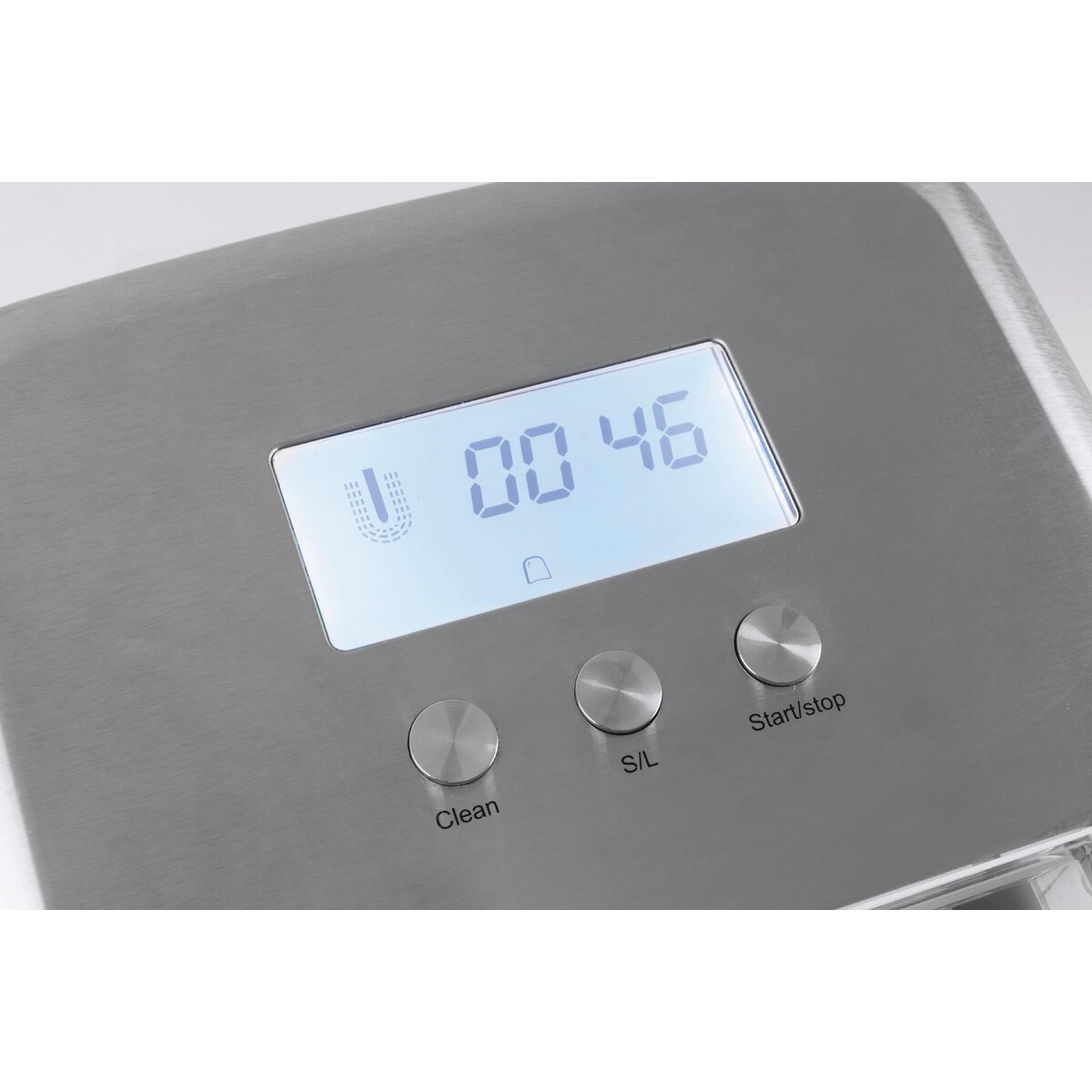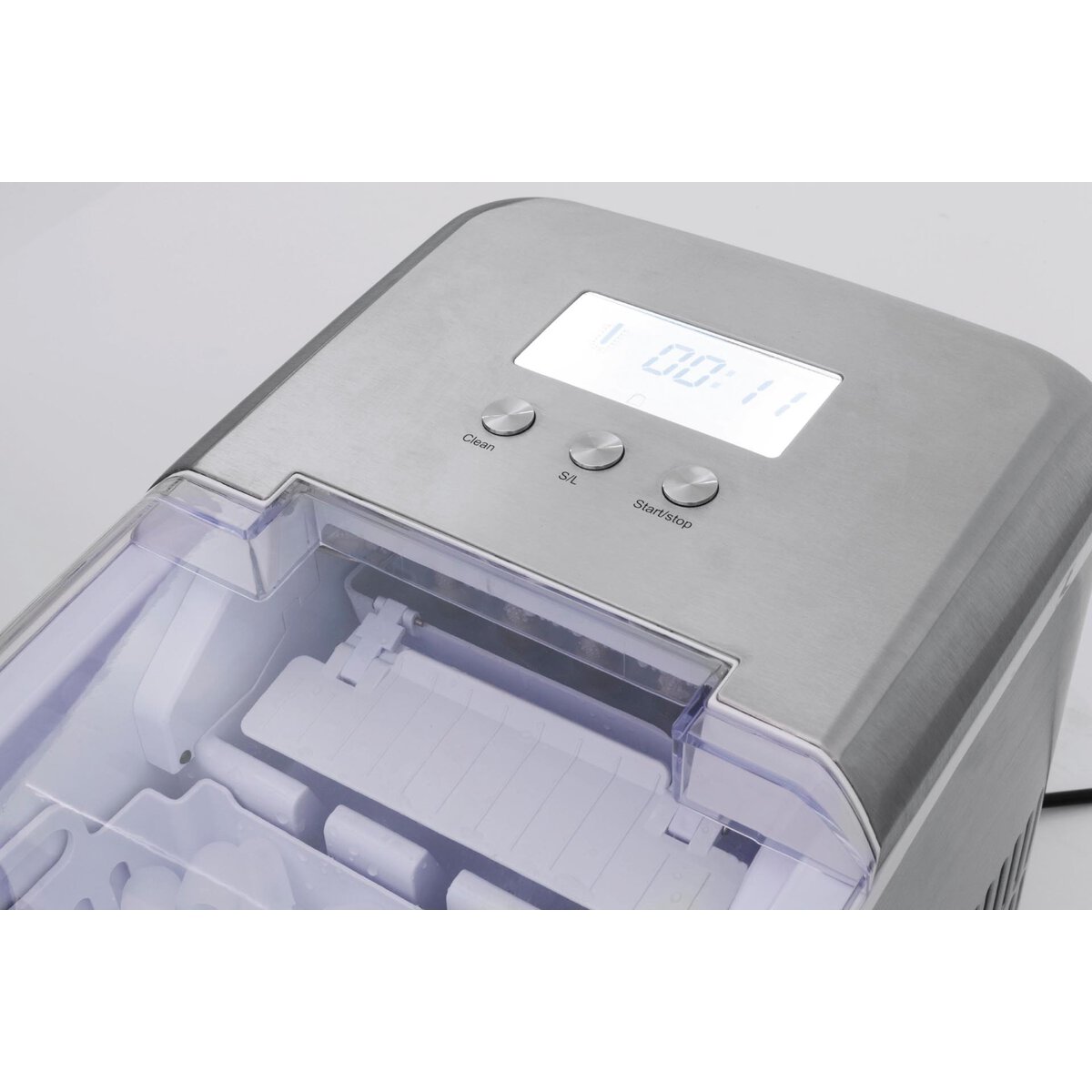 Hochwertiges Edelstahlgehäuse, schnelle Eiswürfel in ca. 6-13 min. dank Kompressortechnik, produziert ca. 500 g Eiswürfel/h (durchschnittlicher Wert nach 3 Std. Laufzeit), zwei Eiswürfelgrößen, klein & groß, einstellbare Reinigungsfunktion, einfache Bedienung und Übersicht per LCD Display, transparenter Deckel, praktisch herausnehmbarer Eiswürfelbehälter (1,3L), großer Wassertank mit 2,2L Volumen, inkl. handlicher Eisschaufel.