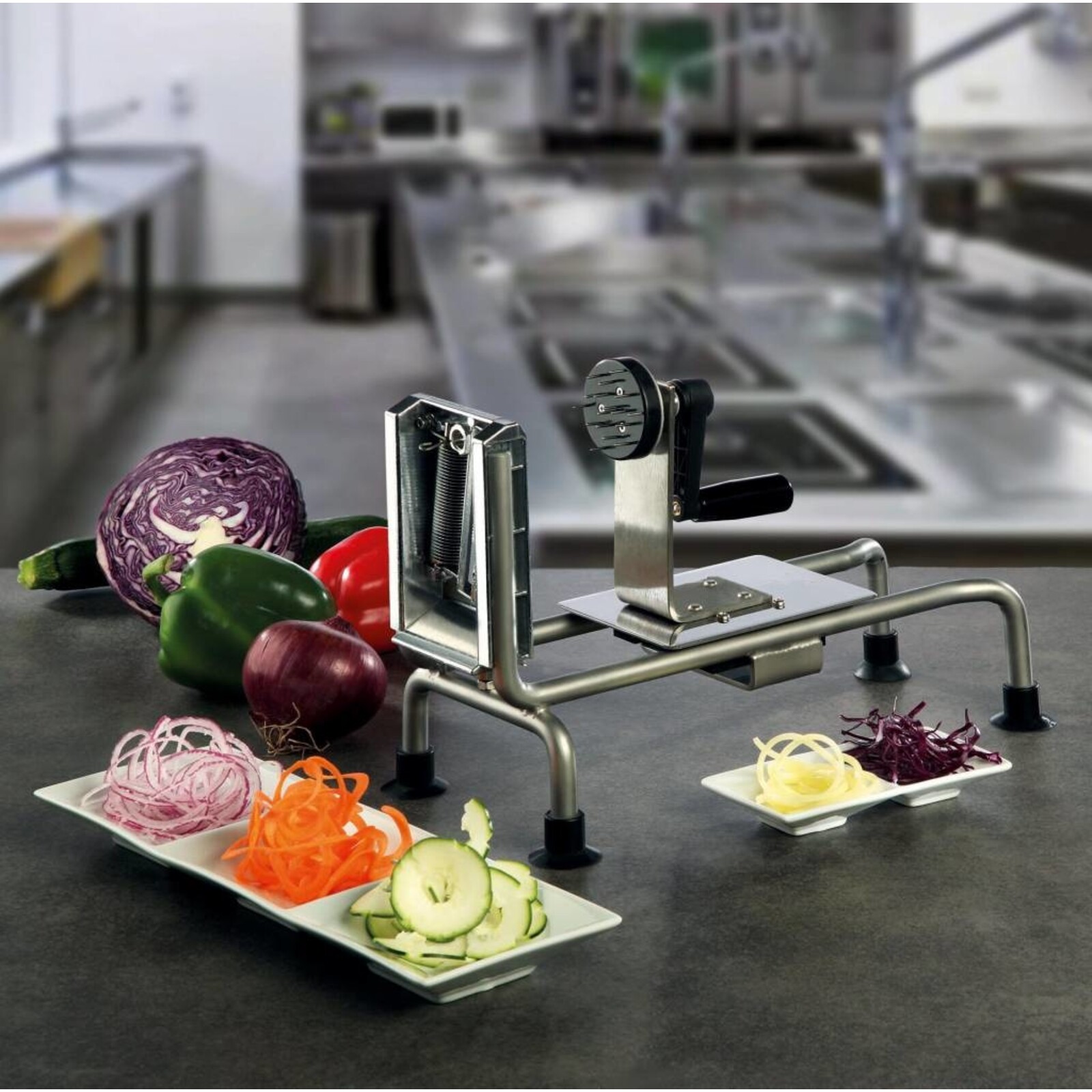 Für dekorative Endlosfäden aus versch. Gemüsesorten. z.B. Möhren, Gurken, Zucchini oder Rotkohl. Edelstahl 18/10 rostfrei, mit Schlitten und Kunststoffkurbel.