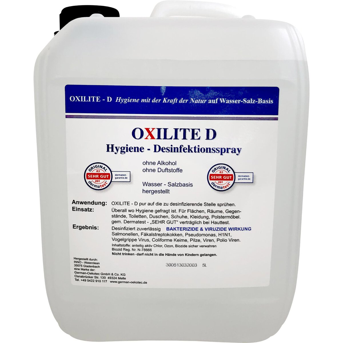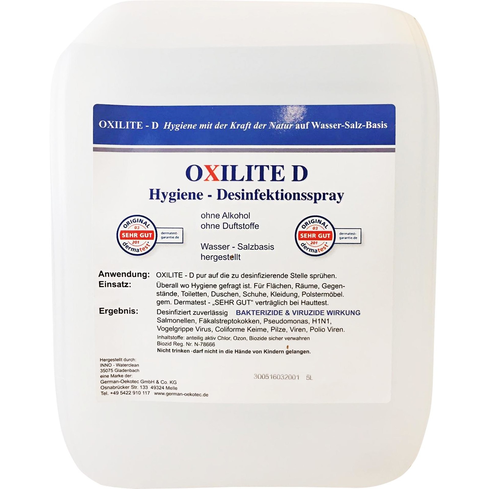 Desinfektionsmittel. Bakterizide & viruzide Wirkung. Ohne Alkohol, ohne Duftstoffe. Auf Wasser- Salzbasis hergestellt. Pur auf die desinfizierende Stelle sprühen. Überall wo Hygiene gefragt ist. Für Flächen, Räume, Gegenstände, Toiletten, Duschen, Schuhe, Kleidung, Polstermöbel. Gem. Dermaltest - "sehr gut" verträglich bei Hauttest. Inhaltsstoffe: anteilig aktiv Chlor, Ozon, Biozide sicher verwahren. Keine VAH-Listung. Nicht trinken - darf nicht in die Hände von Kindern gelangen.