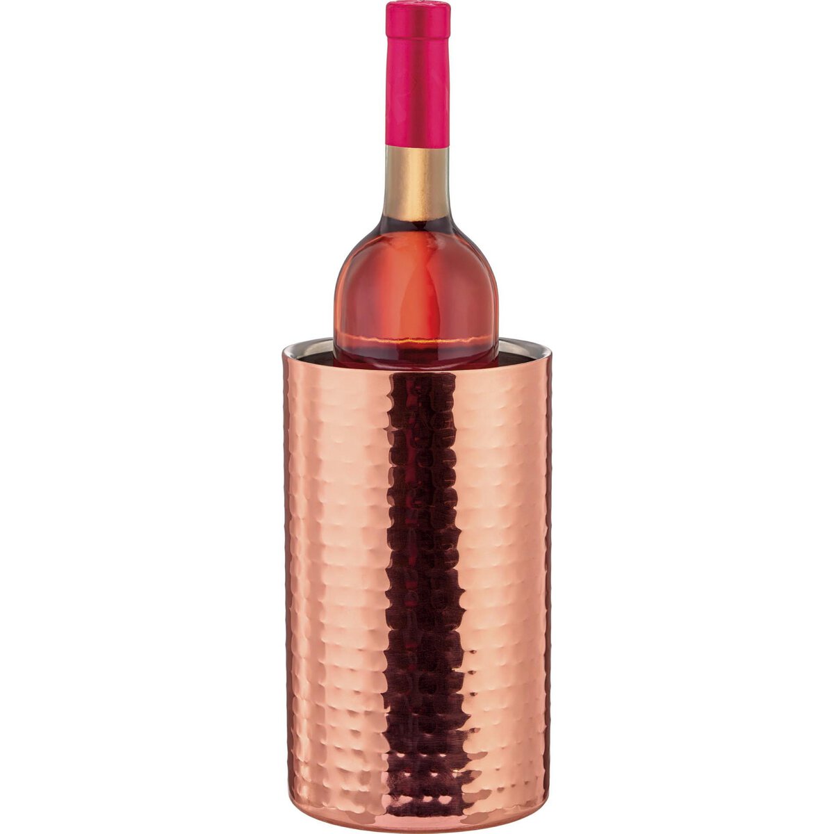 Edelstahl, doppelwandig, außen verkupfert und mit Hammerschlagoptik. Anlaufgeschützt. Für 0,7 L bis 1,5 L Flaschen. Ø in cm: innen 10. Nicht spülmaschinengeeignet.