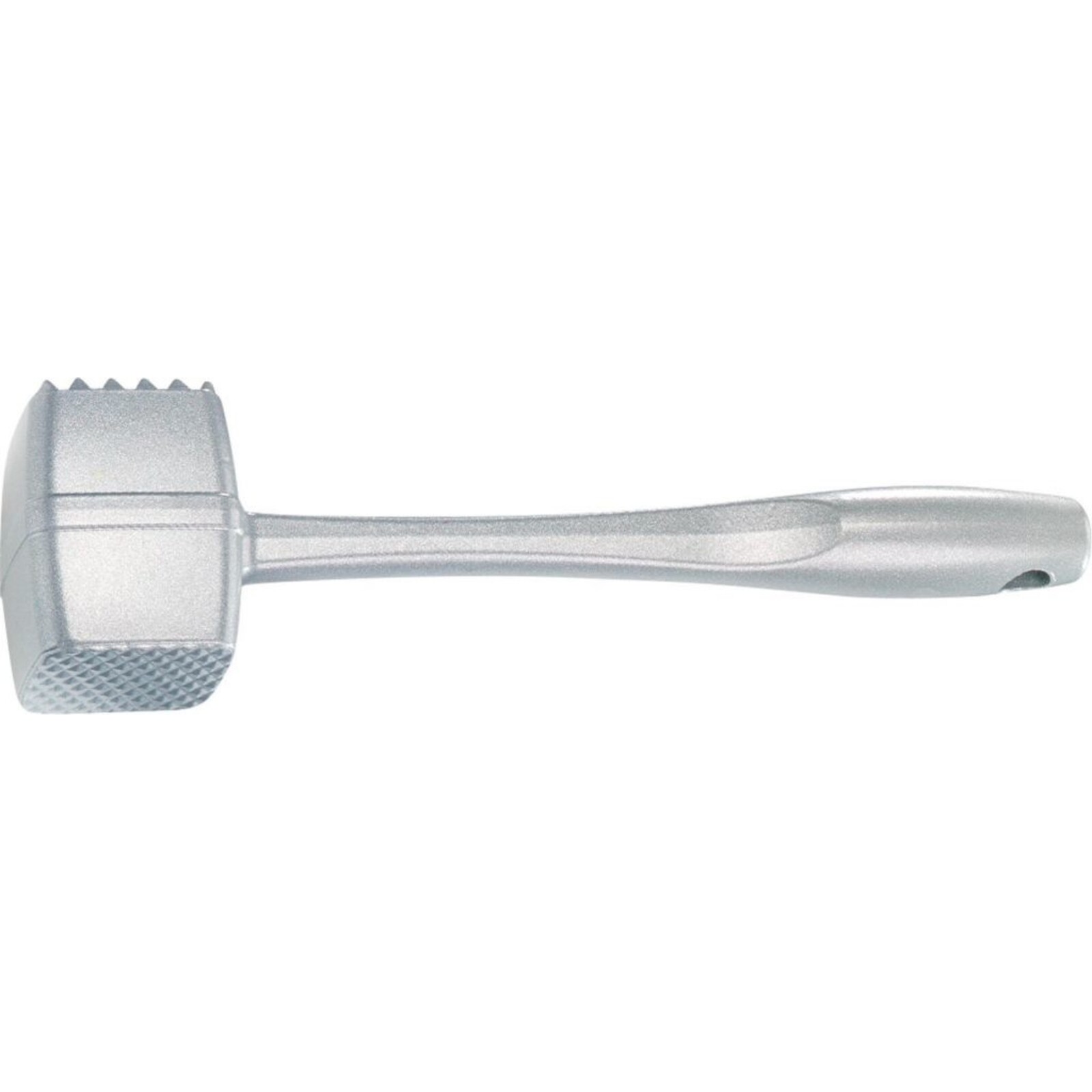 Alu beschichtet. Schwere Ausführung. Zwei unterschiedliche Schlagflächen, eine mit sanften Relief um das Fleisch zu plätten ohne die Faser zu verletzen, die zweite Schlagfläche mit grober Struktur. Spülmaschinengeeignet.