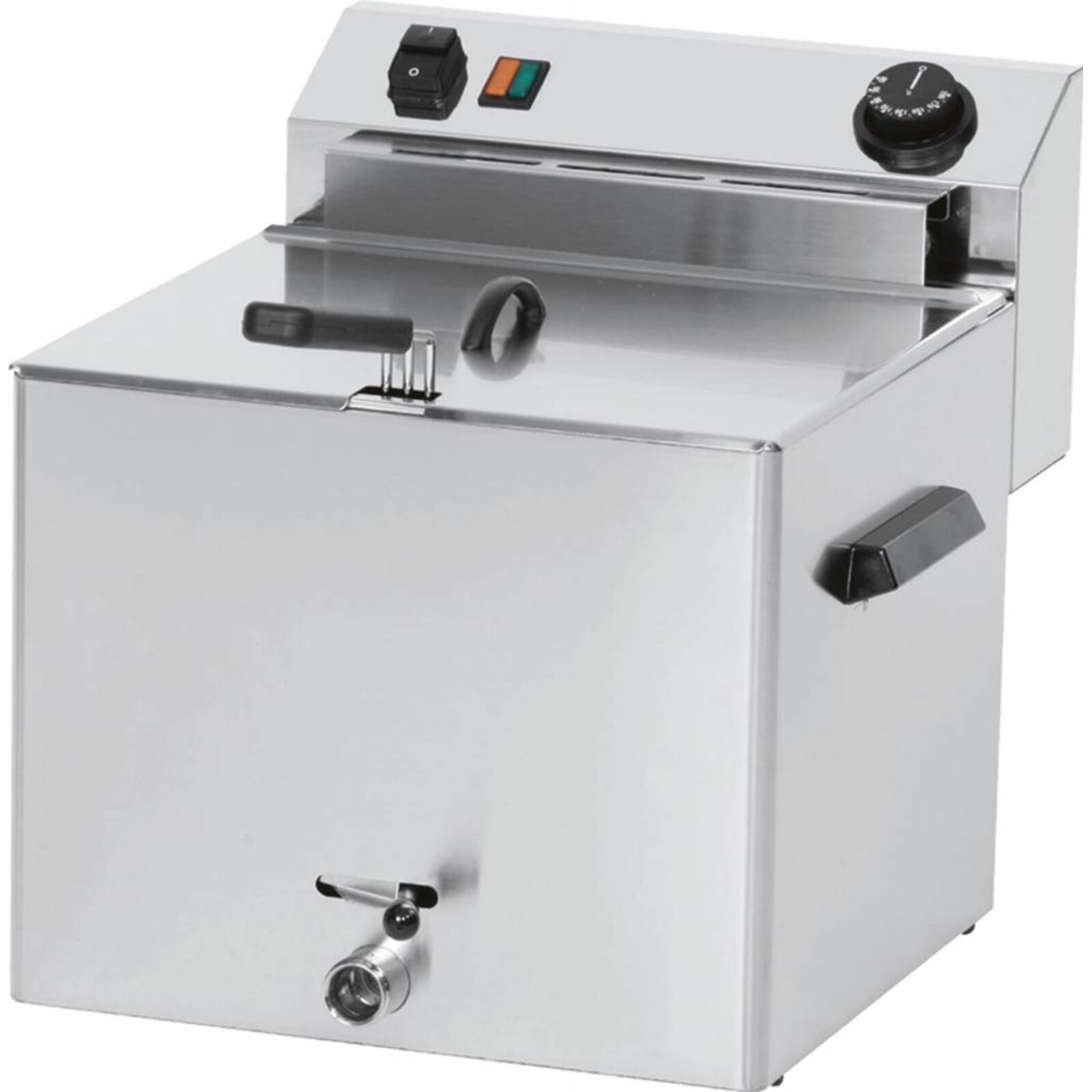 Edelstahl 18/10 mit Auslaufhahn. Die Heizung und das Becken sind herausnehmbar. Inklusive Sicherheitsthermostat, regelbar von 50°C-190°C. Die Fetttemperatur wird thermostatisch konstant gehalten, so dass ein Überhitzen des Fetts ausgeschlossen ist. Gewicht: 13 kg. Nur flüssiges Fett einfüllen! Mit Eurostecker-Anschluss!