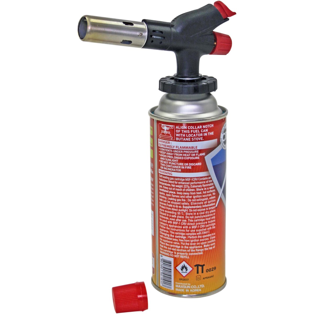 Direkter Anschluss an handelsübliche Gaskartuschen mit EU-Schraubgewinde UNEF 7/16 (Typ D). Breite: 140 mm. Flamme einstellbar: bis ca. 1450°C. Höhe 8cm. Lieferung ohne Gaskartusche.