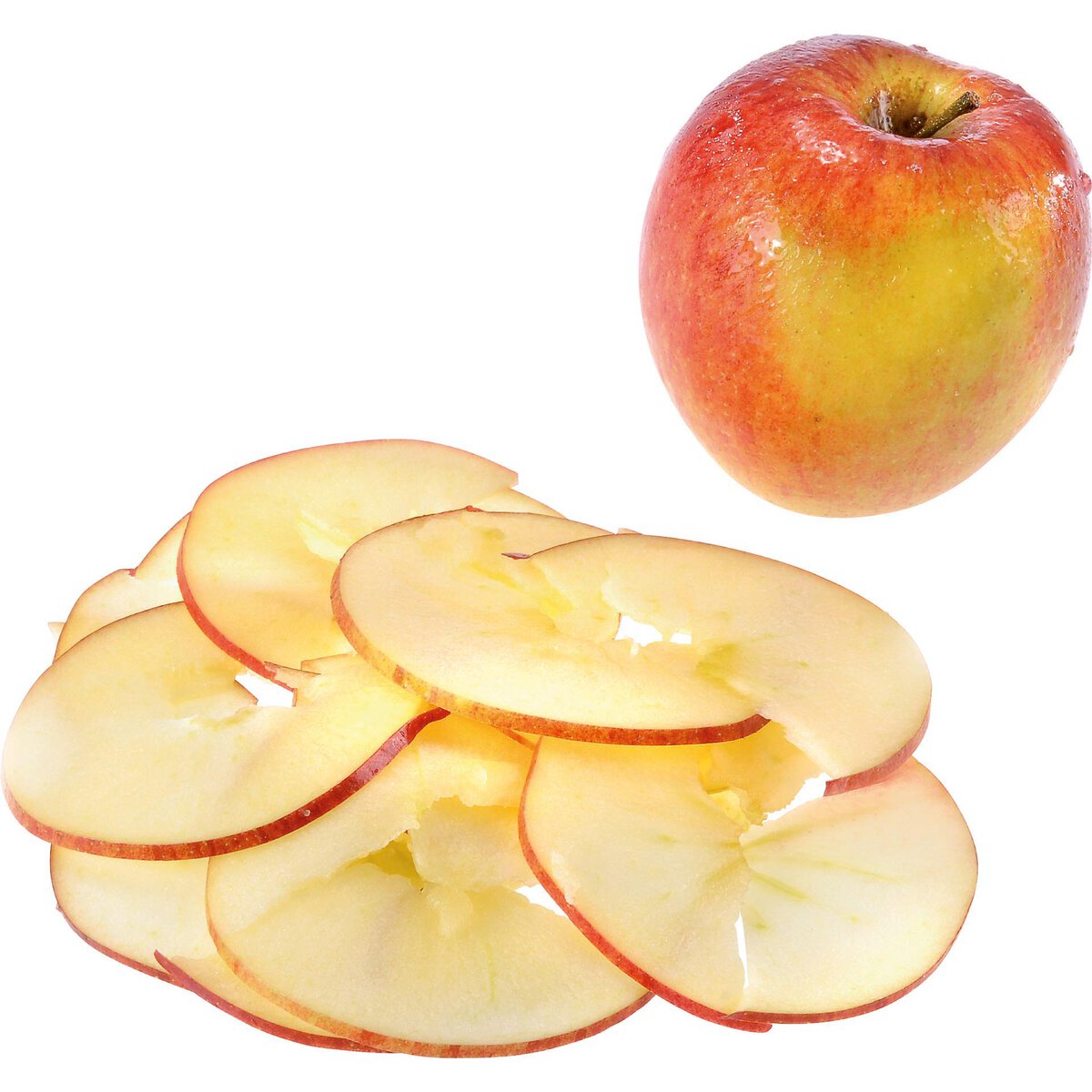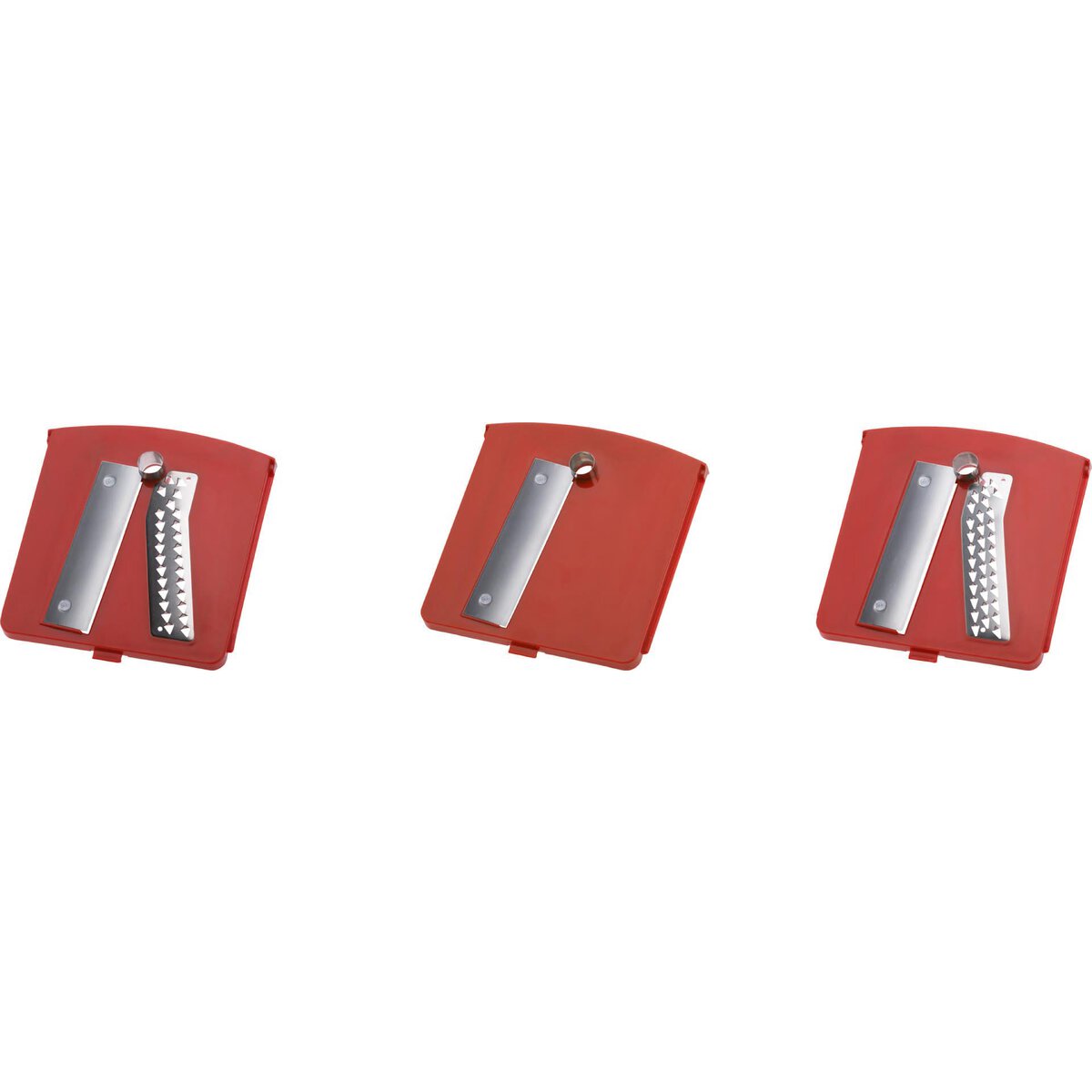 ABS, Edelstahl. Für Obst und Gemüse. 3 sehr scharfe Klingen-Einsätze sorgen für Abwechslung. Praktisch: die jeweils nicht genutzten Schneideinsätze werden schubladenförmig in das Gerät eingesteckt. 4 Gummi-Saugfüße für festen Halt. Spülmaschinengeeignet.