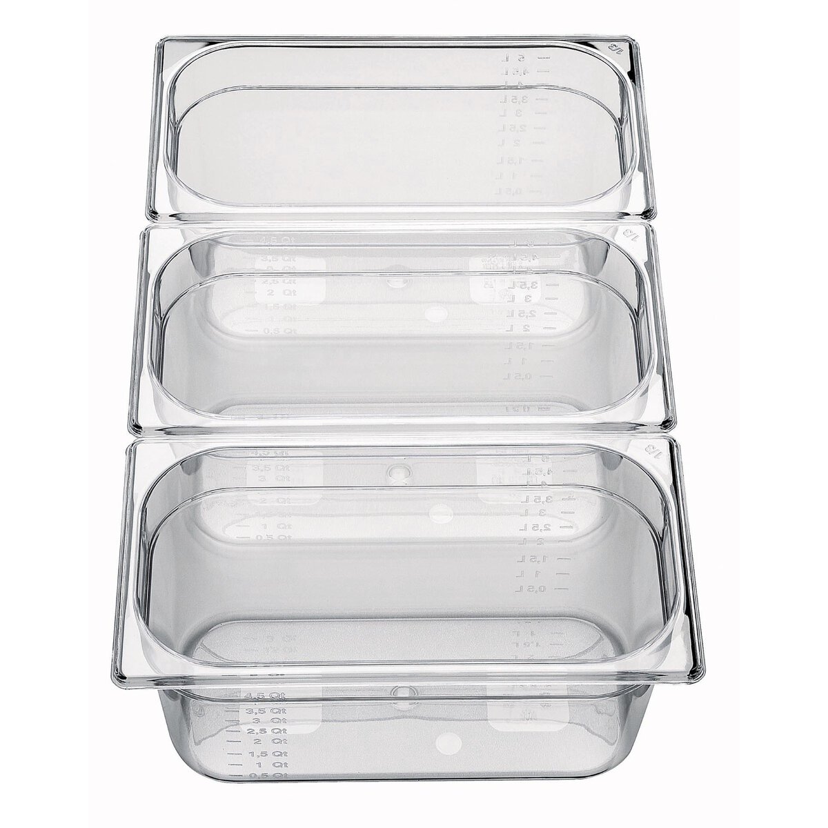 Polycarbonat, transparent, stapelbar, bruchsicher, mit Skalierung. Einsetzbar von -40°C bis +100°C. Spülmaschinen- und mikrowellengeeignet. Passende Deckel bitte separat mitbestellen.