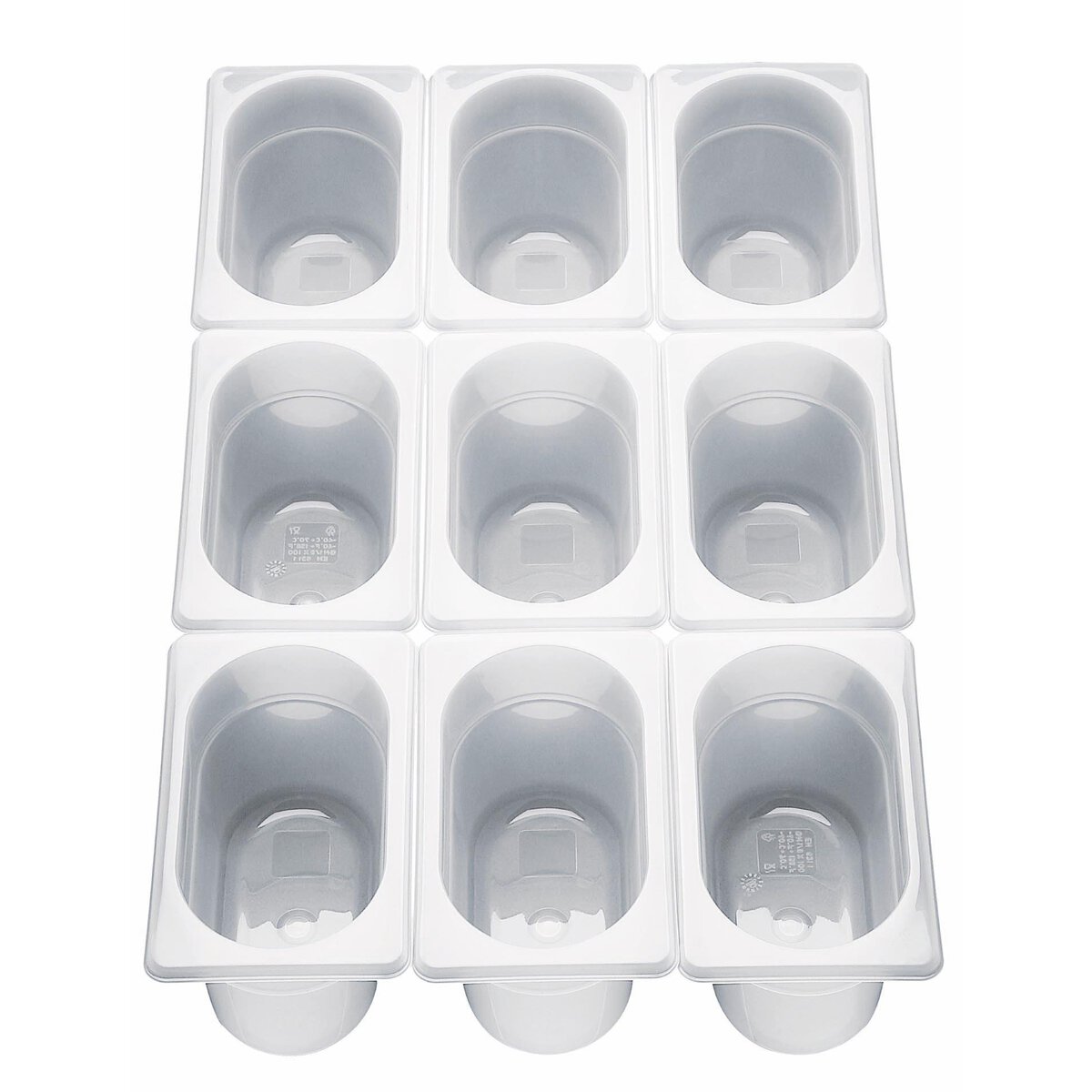 Polypropylen, einsetzbar von -40°C bis +70°C, spülmaschinen- und mikrowellengeeignet.