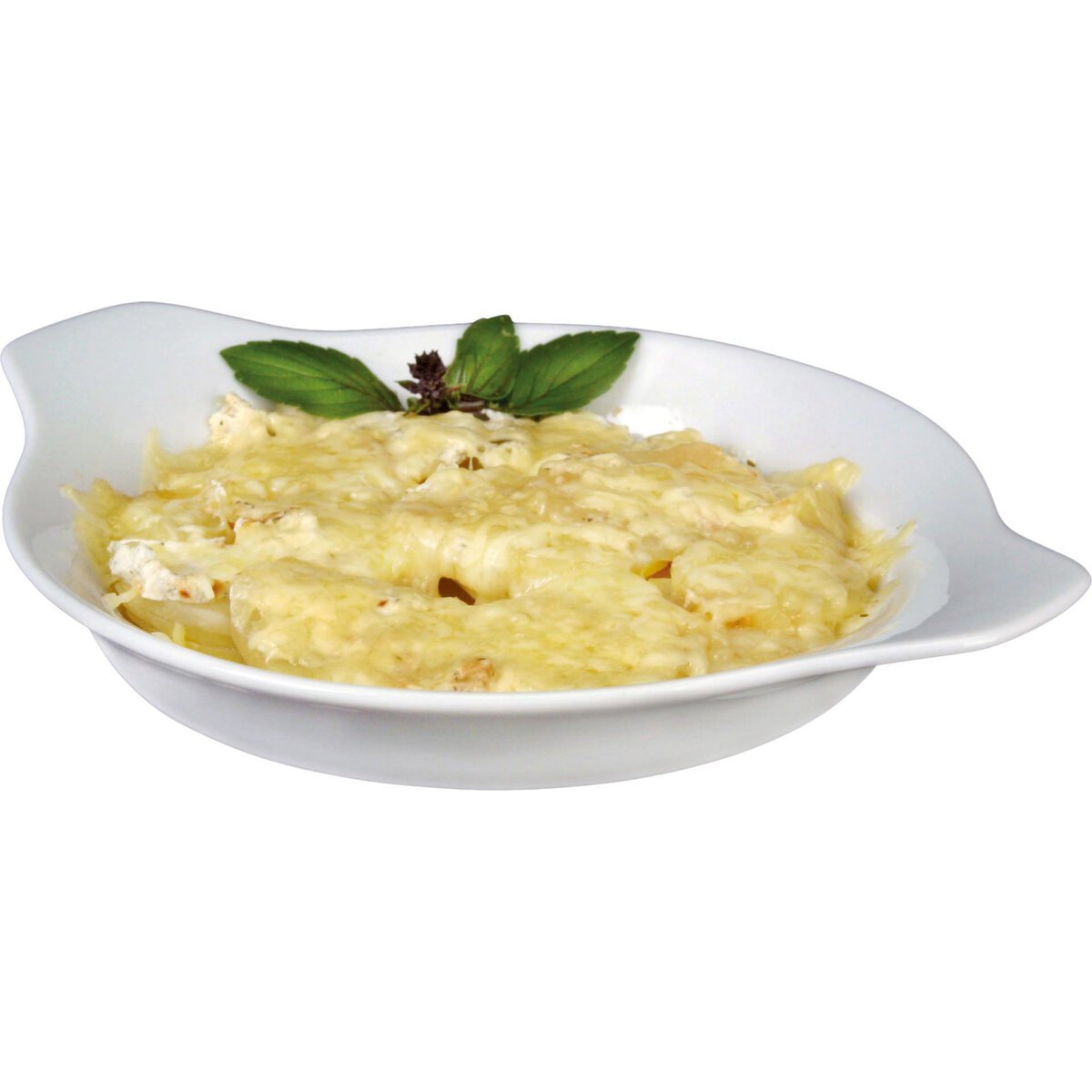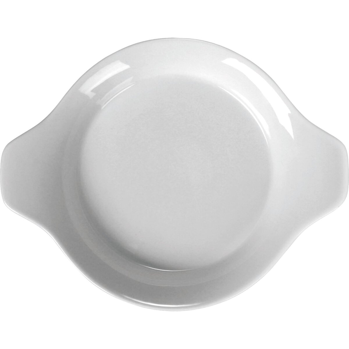 Porzellan, weiß. Planer Boden. Feuerfest bis 350°C. Spülmaschinengeeignet. Mikrowellenfest.