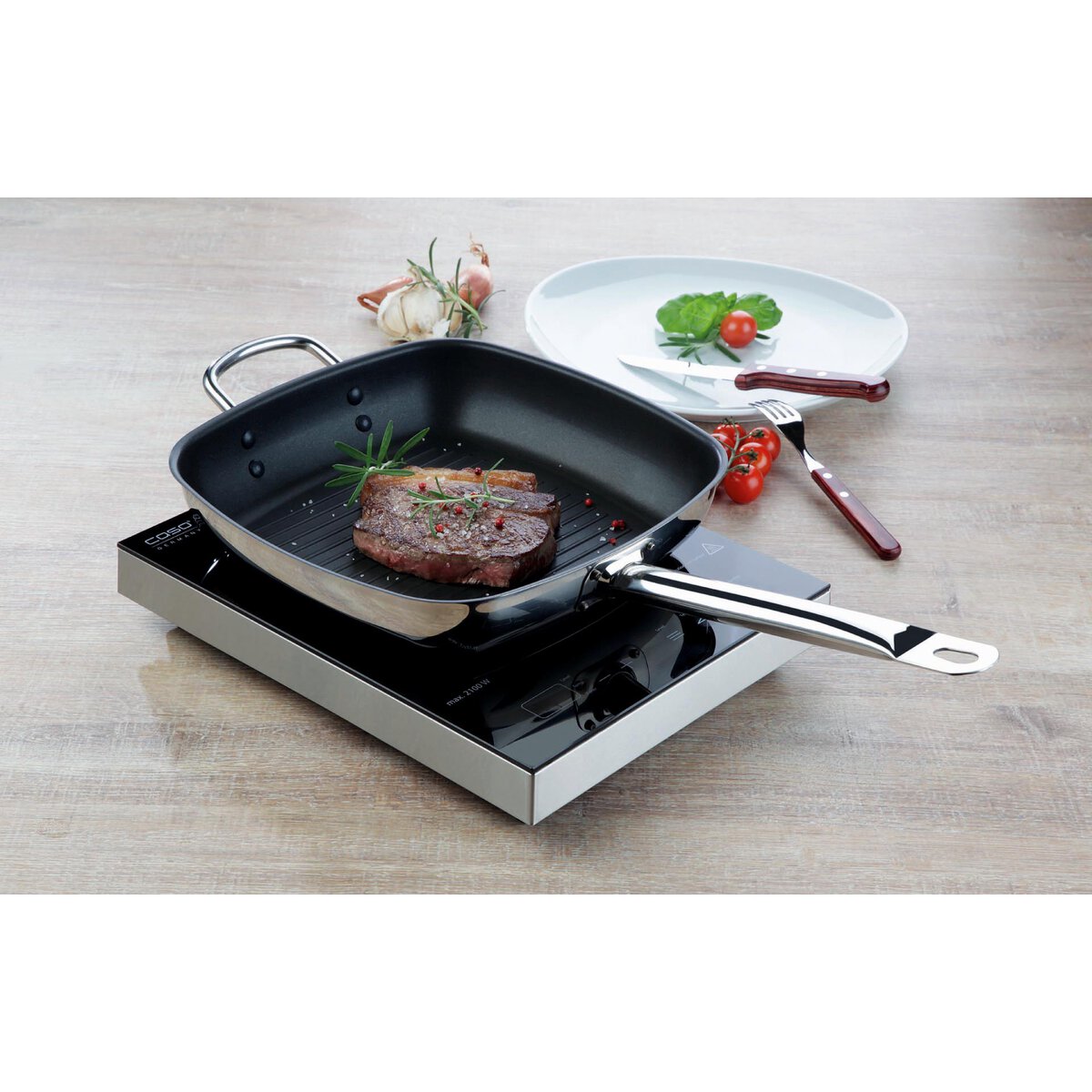 Serie Cookmax Professional. Edelstahl 18/10. Sandwichboden. Mit Stielgriff und Gegengriff. Außen poliert. Gerillte Bratfläche. Mit Teflon-Select-Antihaftbeschichtung.