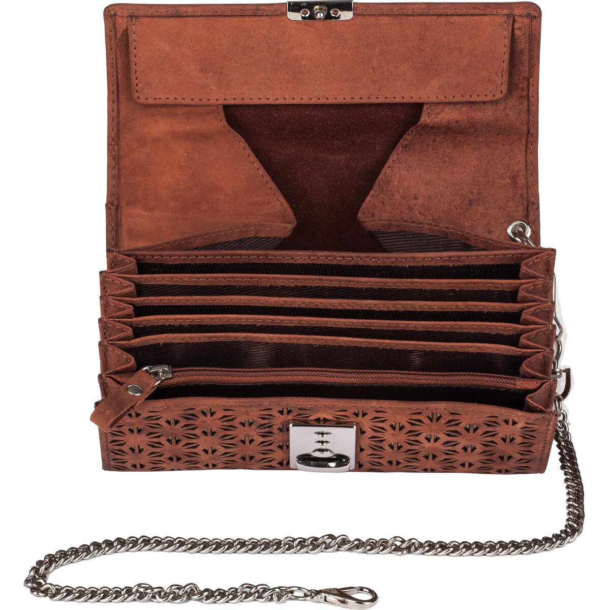Echtleder (Nubuk). Mit Motivstanzungen. Bestehend aus: 1x Münzfach, 6x Scheinfach, 1x Reißverschlussfach, 1x Steckfach an der Rückseite. Schlüsselkette mit Karabinerhaken.