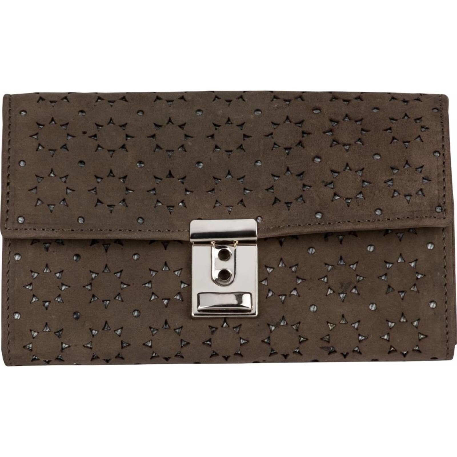 Echtleder (Nubuk). Mit Motivstanzungen. Bestehend aus: 1x Münzfach, 6x Scheinfach, 1x Reißverschlussfach, 1x Steckfach an der Rückseite. Schlüsselkette mit Karabinerhaken.