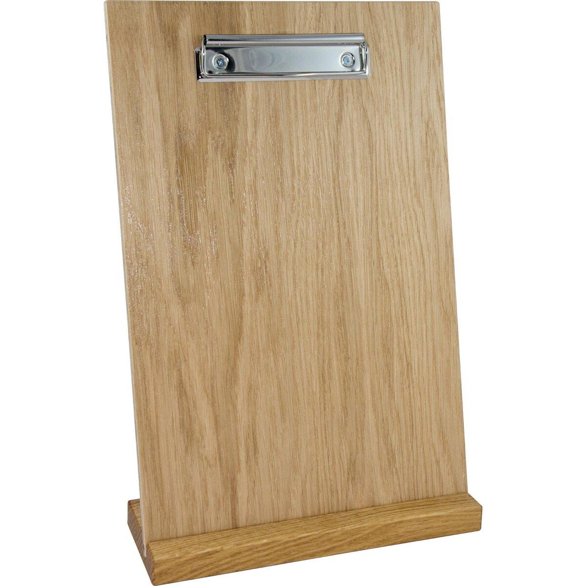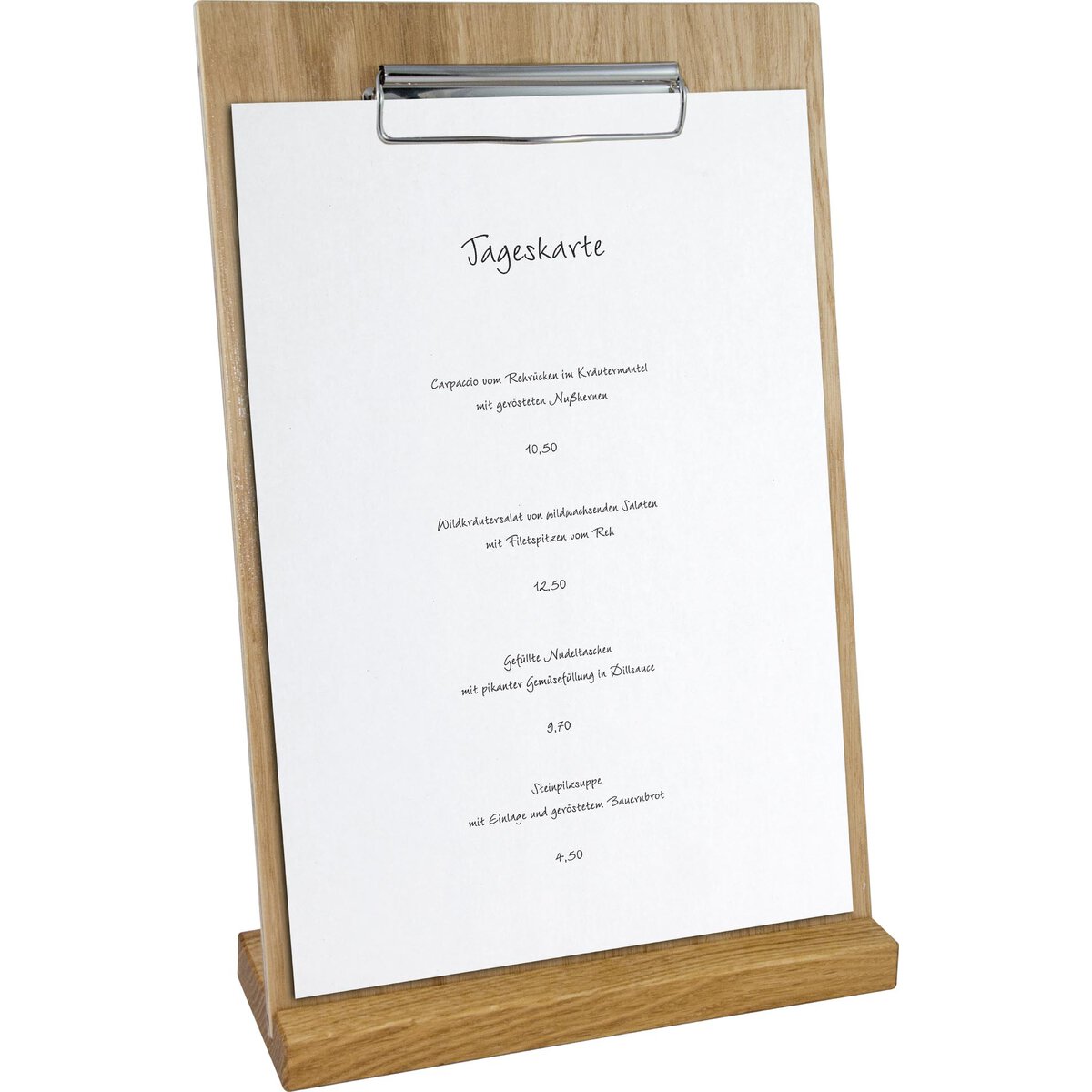Holz. Mit Klemmleiste. Abgerundete Ecken. Mit dem Speisenkarten-Klemmbrett kann ganz einfach die Tageskarte oder Ihr speziell auf den Gast abgestimmtes Menü ausgetauscht werden. Die passende Klemmbretthalterung bitte separat dazu bestellen.