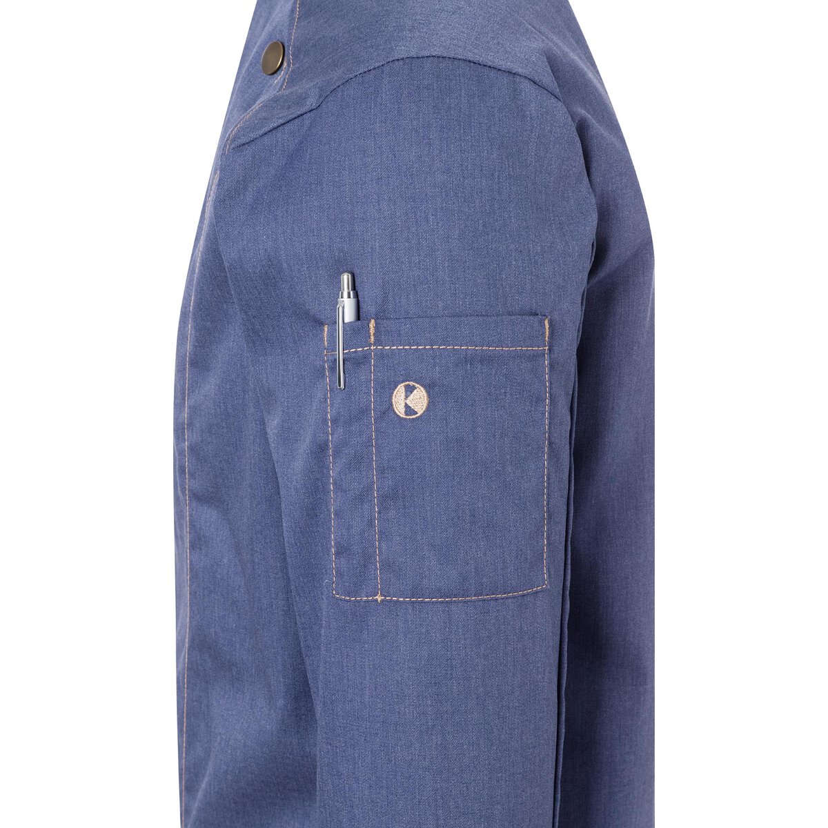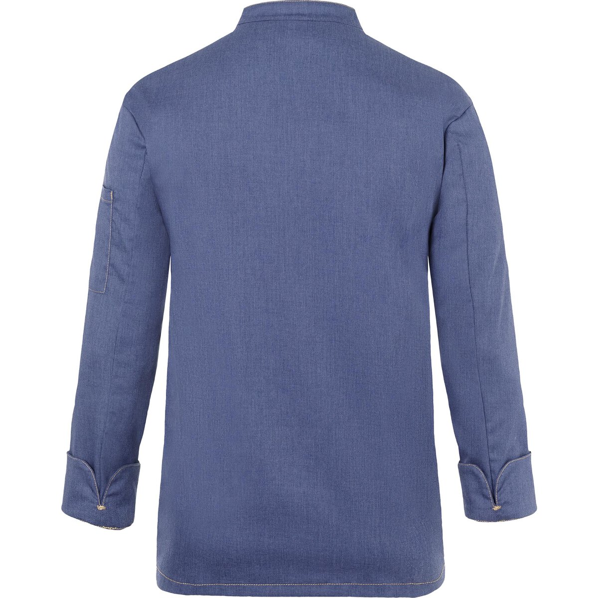 Farbe: Vintage blue. Trendige Kochjacke in Jeans-Optik mit schlanker Silhouette. Kontrastfarbige Steppnähte für den originalen Jeans-Look. Asymmetrisch geschlossene, einreihige 5-Knopf-Jacke mit Druckknöpfen zum schnellen Öffnen und Schließen. Ärmelmanschetten mit Schlitz. Aufgesetzte Ärmeltasche links mit praktischem Stiftfach. Industriewäschetauglich (95°C). 65% Polyester/ 35% Baumwolle. Köpergewebe, 195 g/m². Hochveredelt, gekrumpft, waschecht, pflegeleicht.