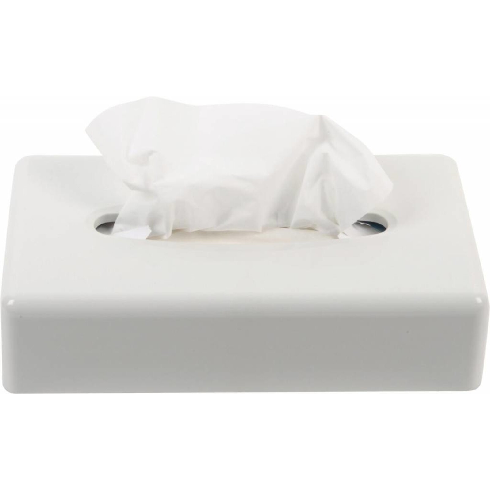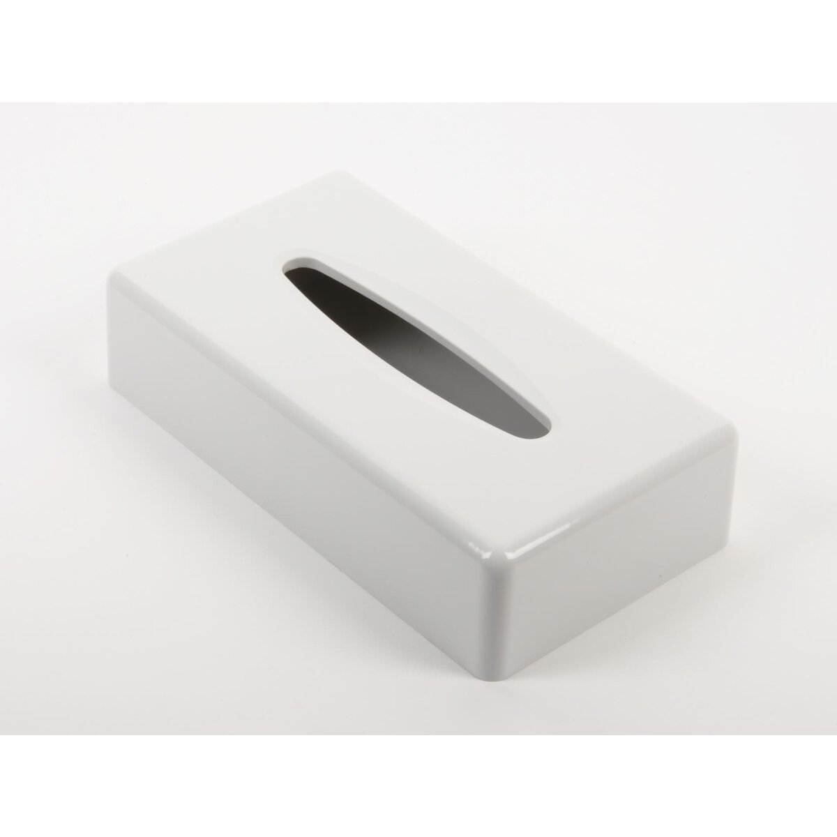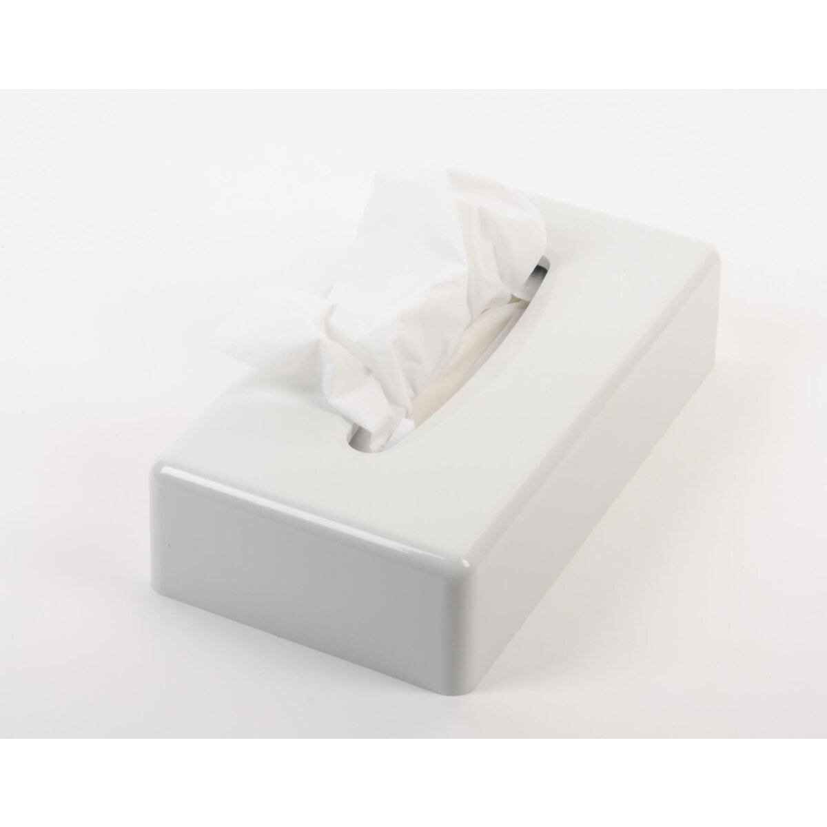 Kunststoff, weiß. Für Tisch und Wand (Befestigungsmaterial wird mitgeliefert). Fassungsvermögen: 100 Tücher. Passend für Kosmetiktücher Art.-Nr. 40178.22.