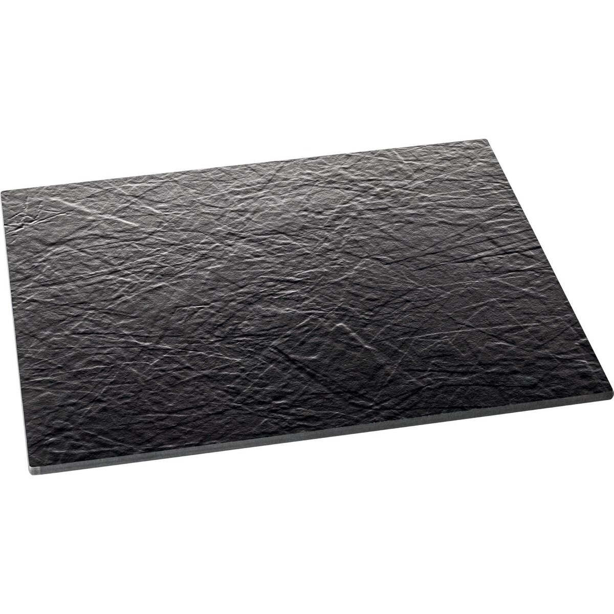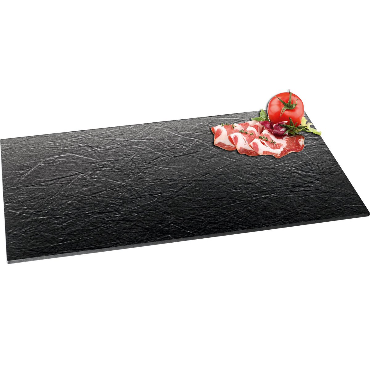 Kunstschiefer. Mit Antirutsch-Gummifüßchen. Lebensmittelunbedenklich, bruch- und kratzfest, geringes Gewicht, spülmaschinengeeignet, hitzefest bis 160°C (nicht für Backofen geeignet).