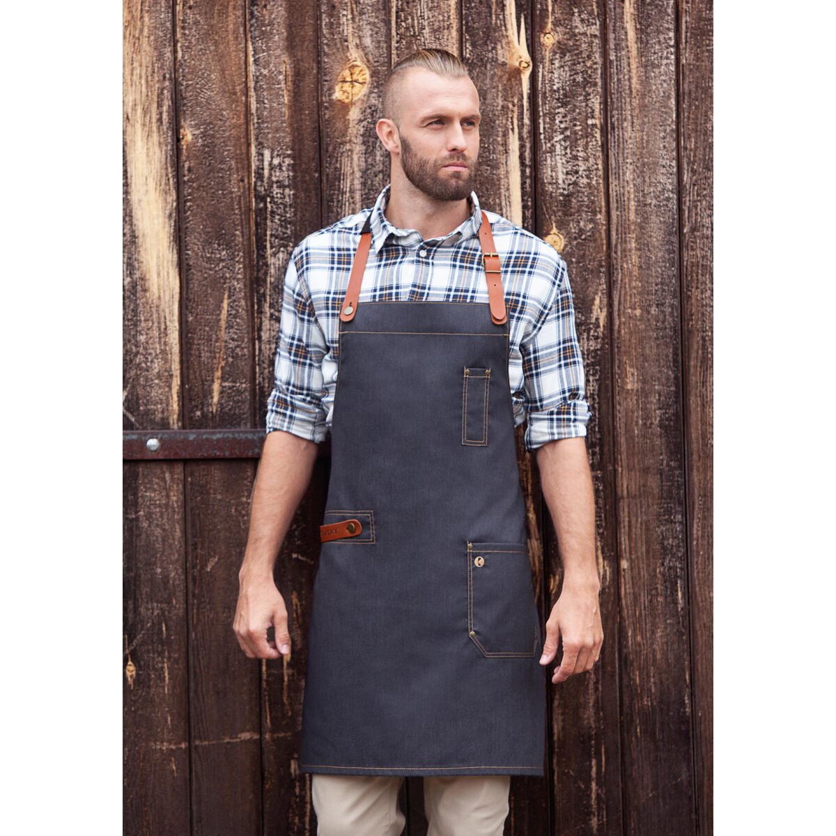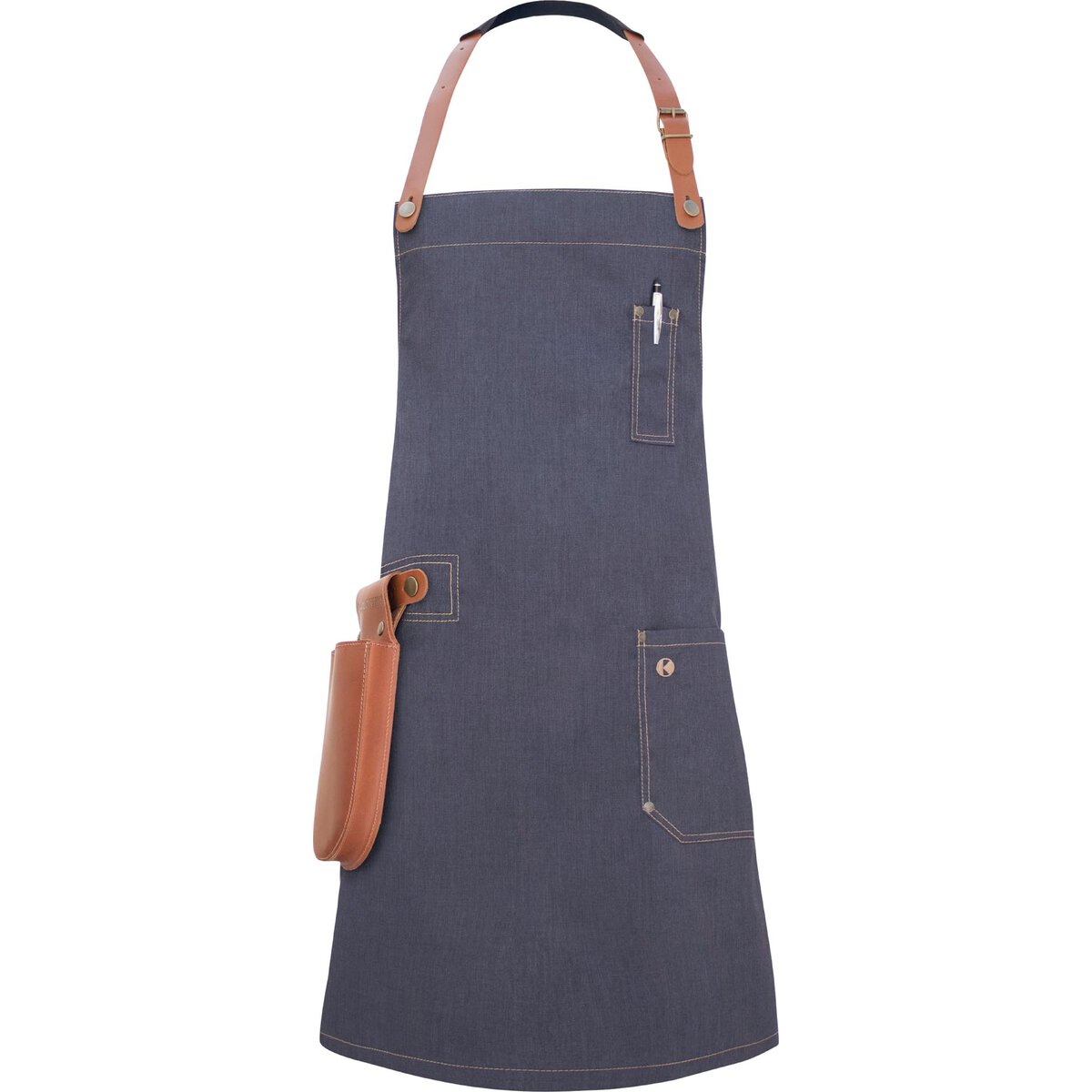 Farbe: Vintage black. Lässig-coole Latzschürze in Jeansoptik mit Accessoires aus 100% Rindsleder. Bronzierte Nieten und kontrastfarbige Steppnähte sorgen für einen unverwechselbaren Vintage-Look. Leicht einstellbares Lederlatzband mit 5 vorgestanzten Löchern und Scheuerschutz im Nackenbereich. Strapazierfähiges Schürzenband mit Nahtverriegelung garantiert einen festen Sitz im Hüftbereich. Praktisches Lederband auf rechter Seite zum Befestigen von Revolvertasche oder Geschirrtüchern. Aufgesetzte Tasche linksseitig (19,0x19,0 cm) mit genieteten Eckenverstärkungen für extra starken Halt. Aufgesetztes Stiftfach mit Ziernieten auf Brusthöhe. 65% Polyester/ 35% Baumwolle. Köpergewebe 195 g/m². Industriewäschetauglich (95°C) da alle Lederteile abnehmbar sind. Hochveredelt, gekrumpft, waschecht, pflegeleicht.