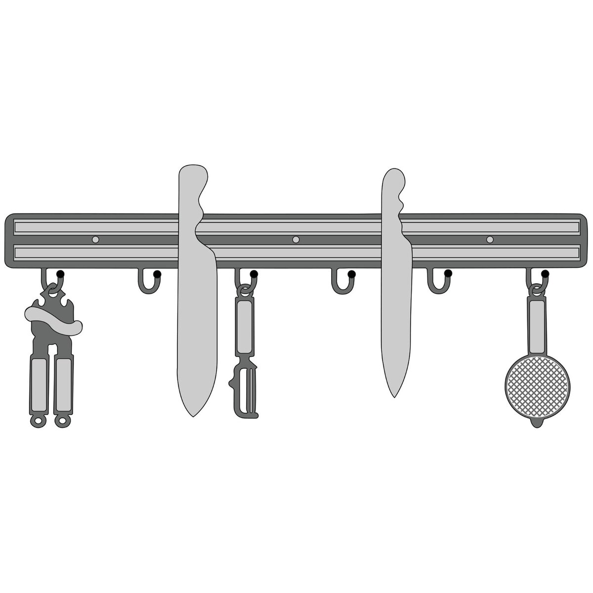 Starke Magnetwirkung. Für schwere Profimesser. Schwarz, Polypropylen, Edelstahl, Weichgummi Magnetstreifen, nicht spülmaschinengeeignet. Inkl. 6 Haken zum Aufhängen von Kochutensilien, sowie 3 Schrauben und 3 Dübel zur Wandbefestigung.