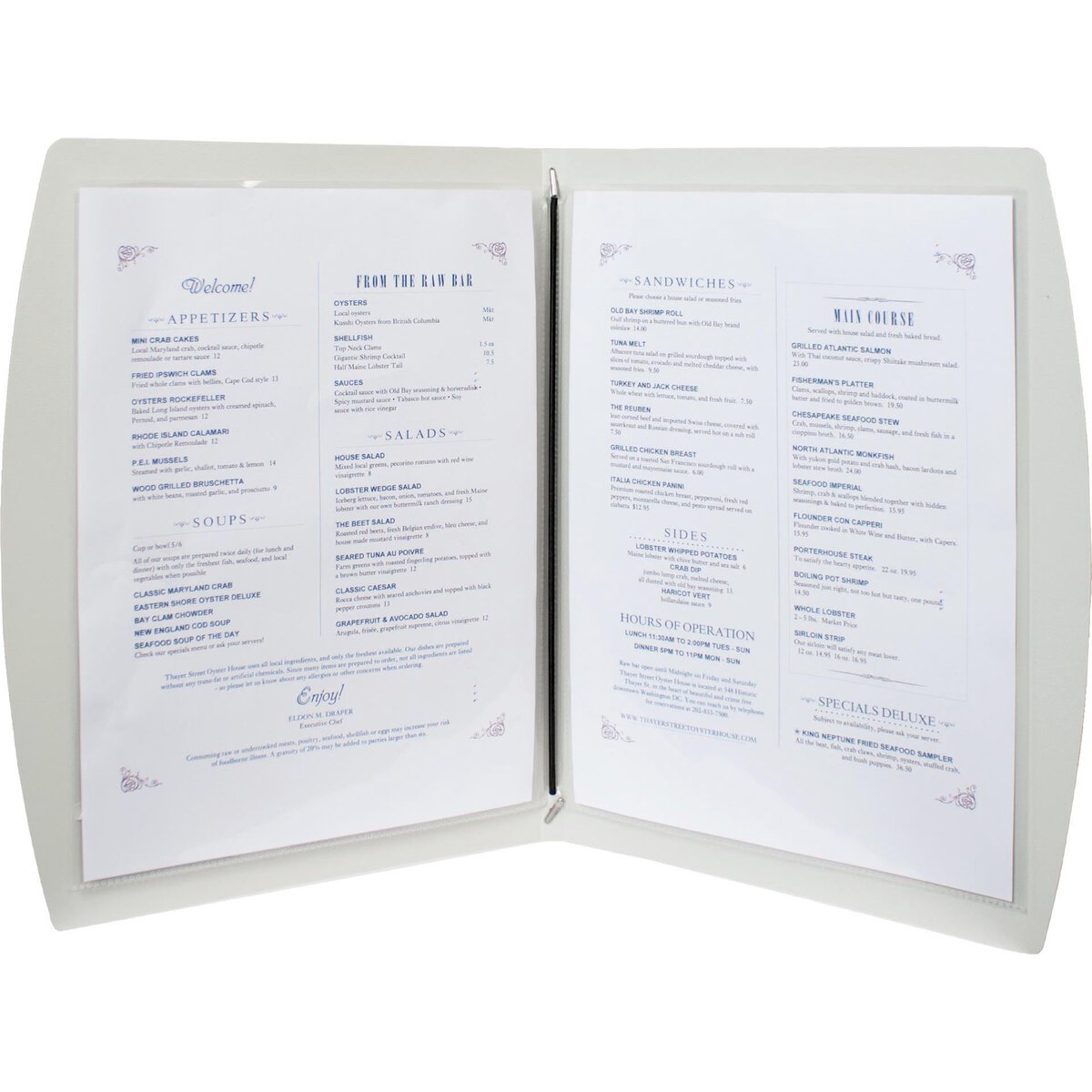 Moderne Strukturkarte aus Kunststoff (PP). Edelstahlschild mit Aufdruck „Menu“, inkl. 1 Doppeleinlage. Für bis zu 10 Einleger geeignet. Heftung: Gummiband mit Doppeleinlage (4 Seiten). Leicht zu reinigen.