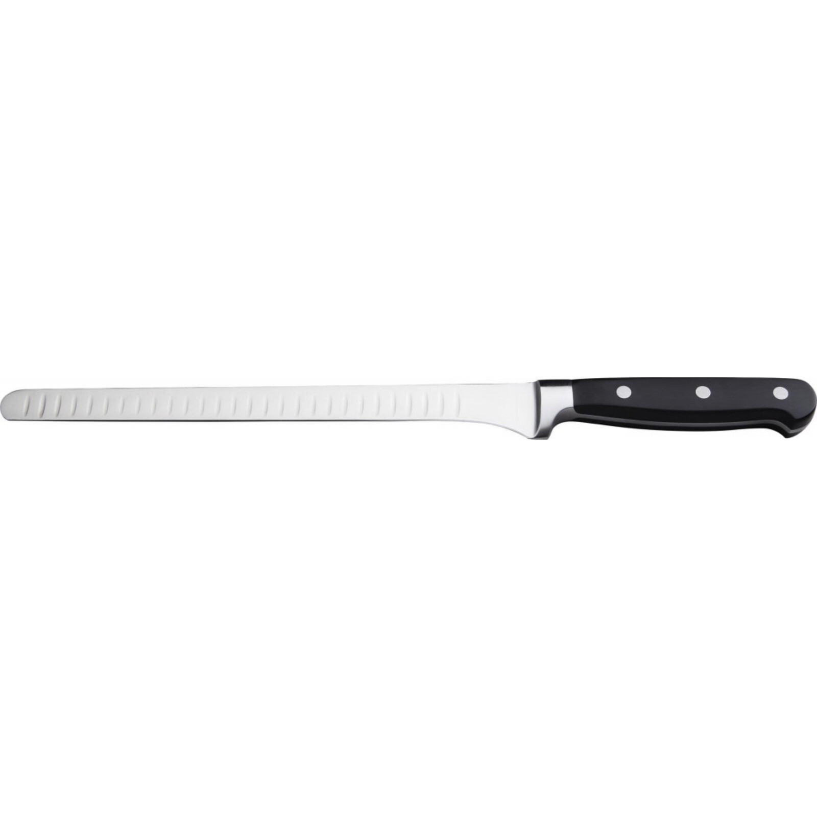 Gehärtet und geschliffen, sehr schnitthaltig. Extreme Langlebigkeit durch verstärkten, durchgehenden Stahlschaft. Der Griff ist aus spülwasserfestem Kunststoff Polyoxymethylen mit jeweils 3 Nieten.