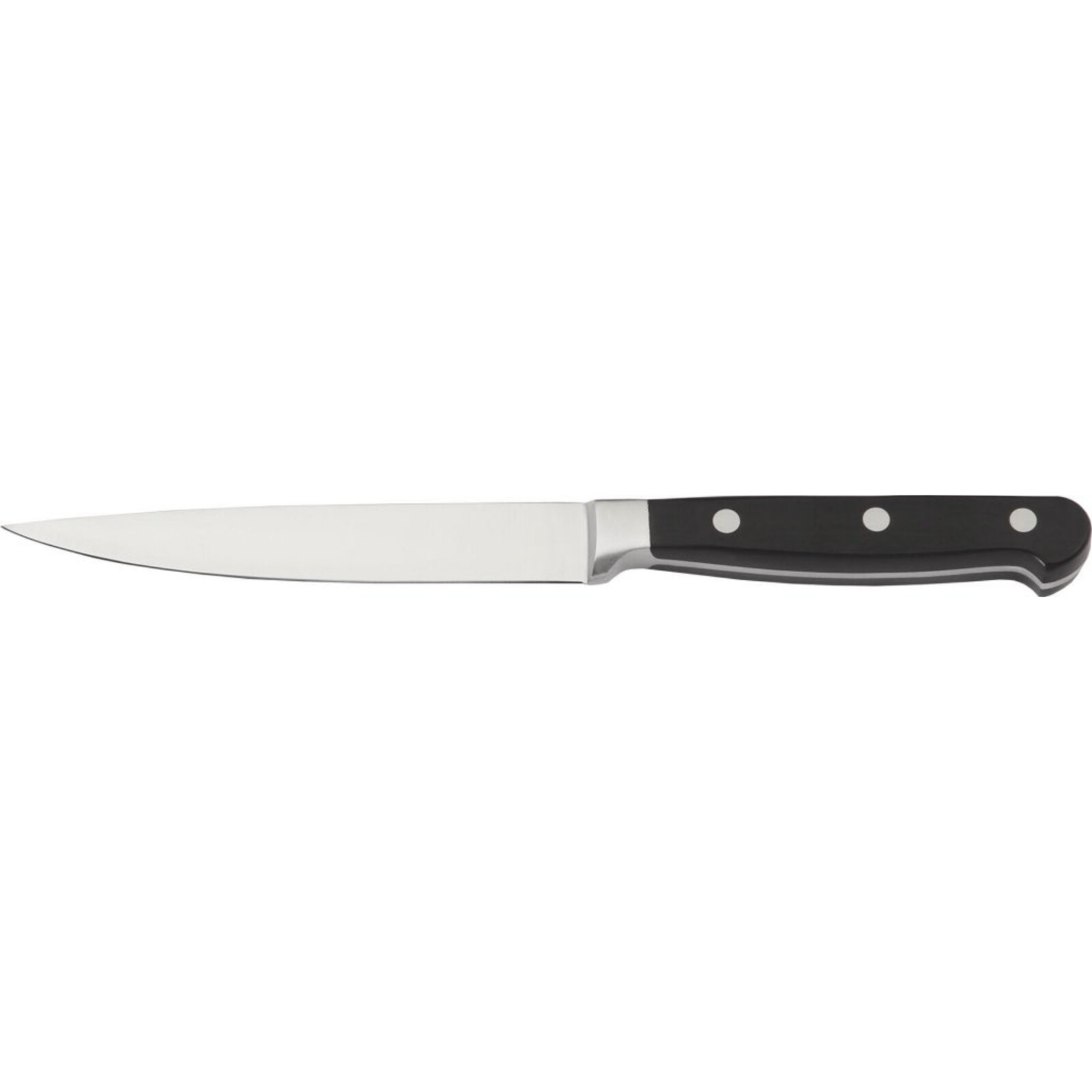 Gehärtet und geschliffen, sehr schnitthaltig. Extreme Langlebigkeit durch verstärkten, durchgehenden Stahlschaft. Der Griff ist aus spülwasserfestem Kunststoff Polyoxymethylen mit jeweils 3 Nieten.