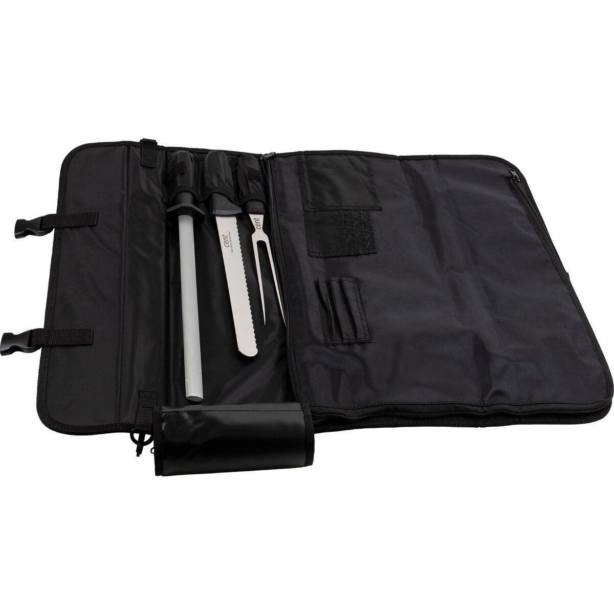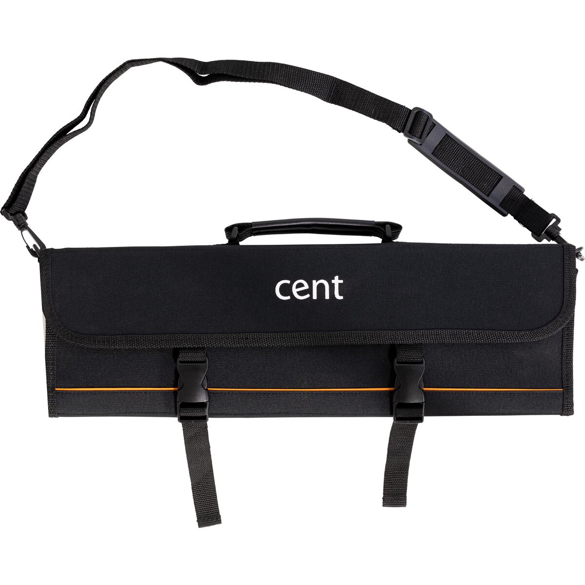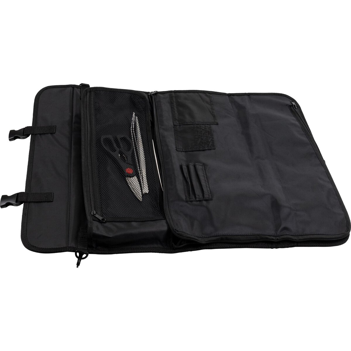 Hauptfach für 7 Messer mit einer max. Gesamtlänge von je 50 cm. Die Messer werden mit einem Gummiband gehalten und sind mit einer Abdeckung geschützt, die 3 Stiftfächer, 4 Visitenkartenfächer, sowie Platz für einen Notizblock (ca. 10x12 cm) beinhaltet und mit einem Reißverschluss fixiert ist. Zusätzliches Netzfach (ca. 13x39 cm) bietet sicheren Platz z. B. für eine Küchenschere oder sonstige Kleinteile. Dieses dient als Abdeckung für weitere 3 Accessoires – z. B. Wetzstahl, Fleischgabel, Handreibe (werden jeweils auch mit einem Gummiband gehalten) und ist mit 2 Klettverschlüssen fixiert. Rückseite mit transparentem Fach für Namenskärtchen/ Adresse und weiterem Reißverschlussfach (ca. 12x49 cm). Längenverstellbarer Klickverschluss, abnehmbarer Schultertragegurt (längenverstellbarer) und Tragegriff. Aus strapazierfähigem Textilgewebe, reiß- und abriebfest. Abmessungen geschlossen: ca. 52x18x7 cm. Farbe: schwarz mit orangem Streifen. Ohne Inhalt.