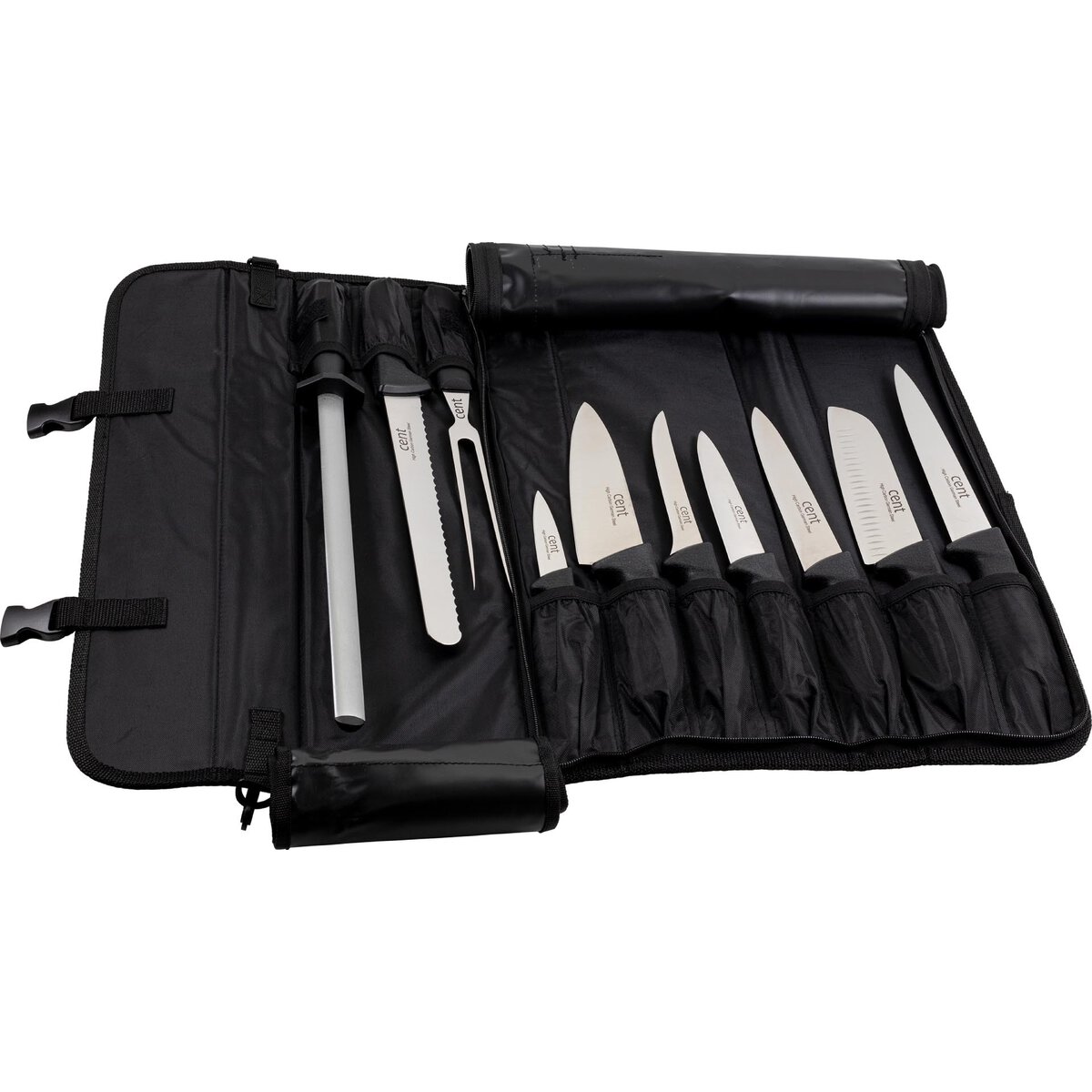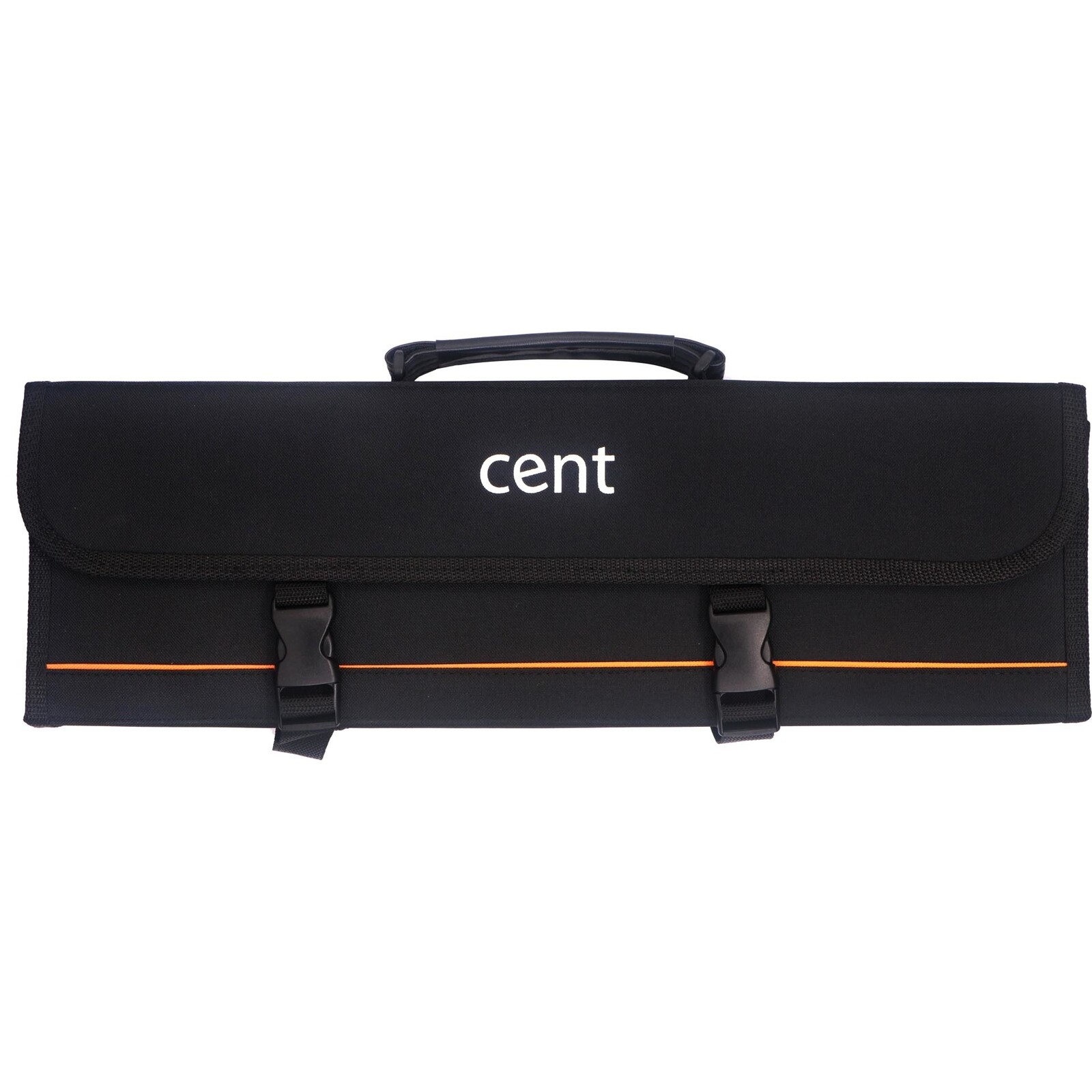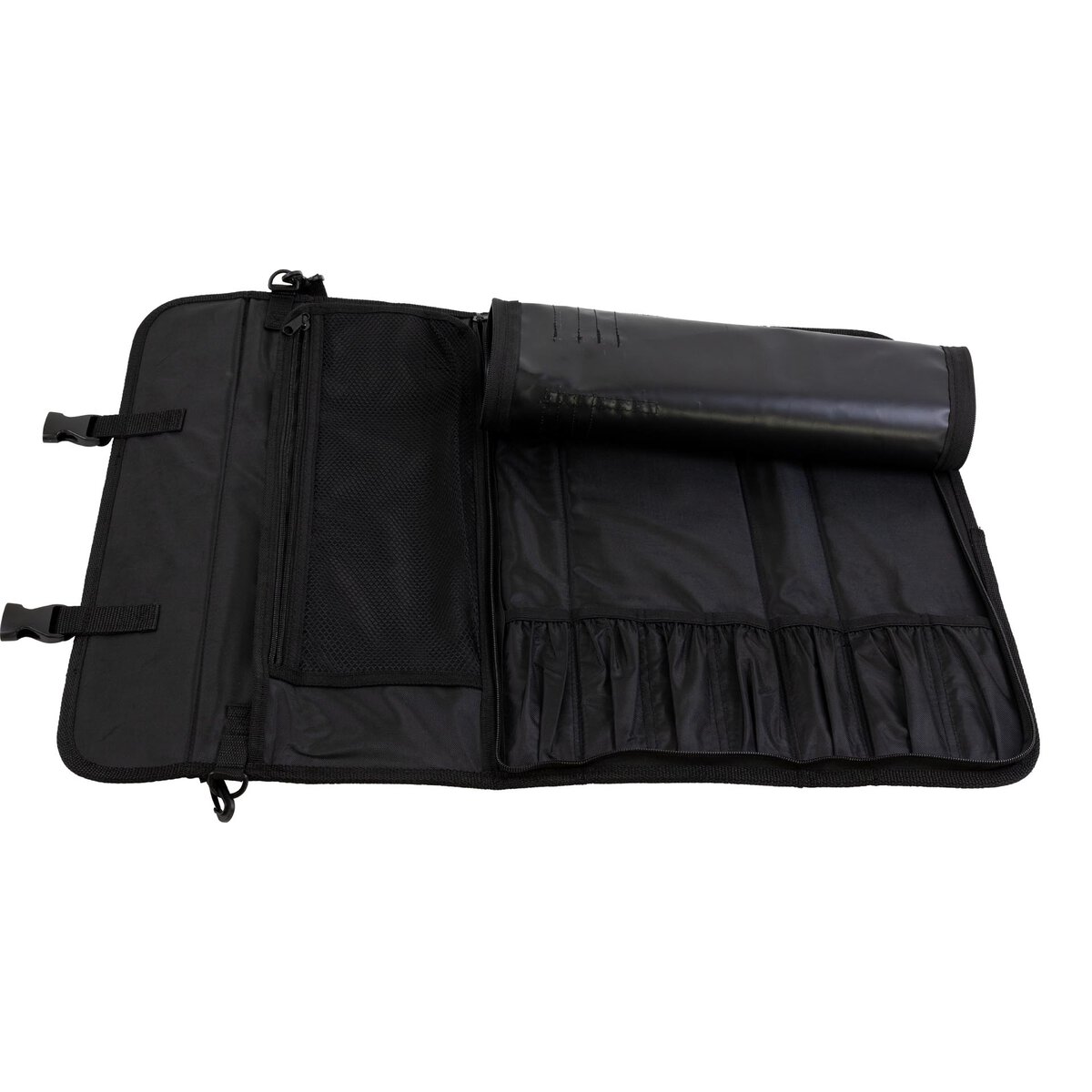 Hauptfach für 7 Messer mit einer max. Gesamtlänge von je 50 cm. Die Messer werden mit einem Gummiband gehalten und sind mit einer Abdeckung geschützt, die 3 Stiftfächer, 4 Visitenkartenfächer, sowie Platz für einen Notizblock (ca. 10x12 cm) beinhaltet und mit einem Reißverschluss fixiert ist. Zusätzliches Netzfach (ca. 13x39 cm) bietet sicheren Platz z. B. für eine Küchenschere oder sonstige Kleinteile. Dieses dient als Abdeckung für weitere 3 Accessoires – z. B. Wetzstahl, Fleischgabel, Handreibe (werden jeweils auch mit einem Gummiband gehalten) und ist mit 2 Klettverschlüssen fixiert. Rückseite mit transparentem Fach für Namenskärtchen/ Adresse und weiterem Reißverschlussfach (ca. 12x49 cm). Längenverstellbarer Klickverschluss, abnehmbarer Schultertragegurt (längenverstellbarer) und Tragegriff. Aus strapazierfähigem Textilgewebe, reiß- und abriebfest. Abmessungen geschlossen: ca. 52x18x7 cm. Farbe: schwarz mit orangem Streifen. Ohne Inhalt.
