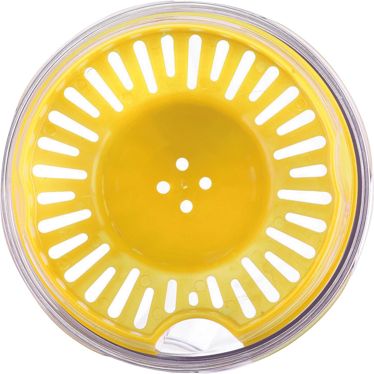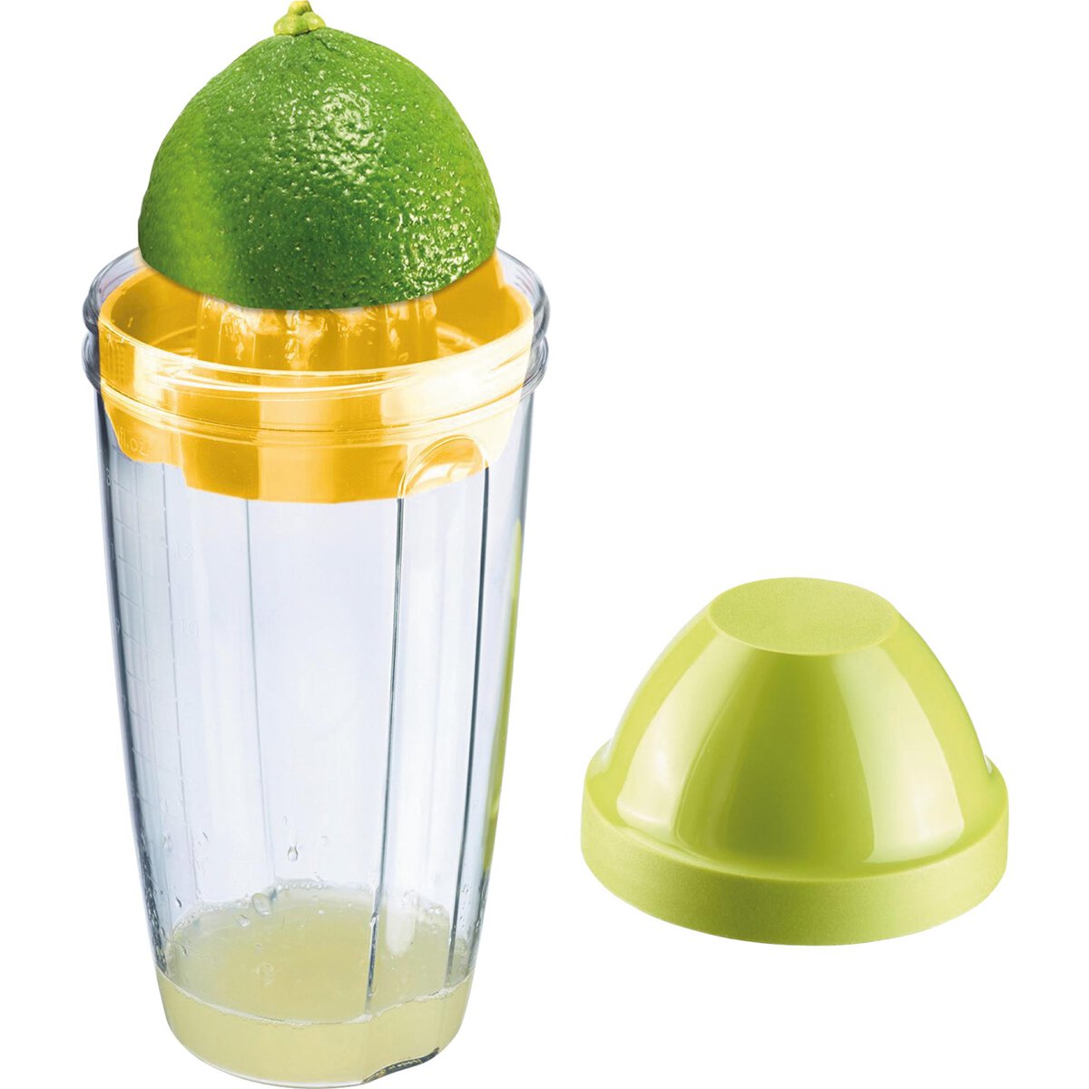 PP, PE, SAN, mit Zitruspresse für Limetten und Zitronen, scharf ausgearbeitete Lamellen am Presskegel sorgen für optimale Saftausbeute, ideal für Salatdressings, die Vertiefung im Becher geben die sichere Halteposition vor, spülmaschinengeeignet.