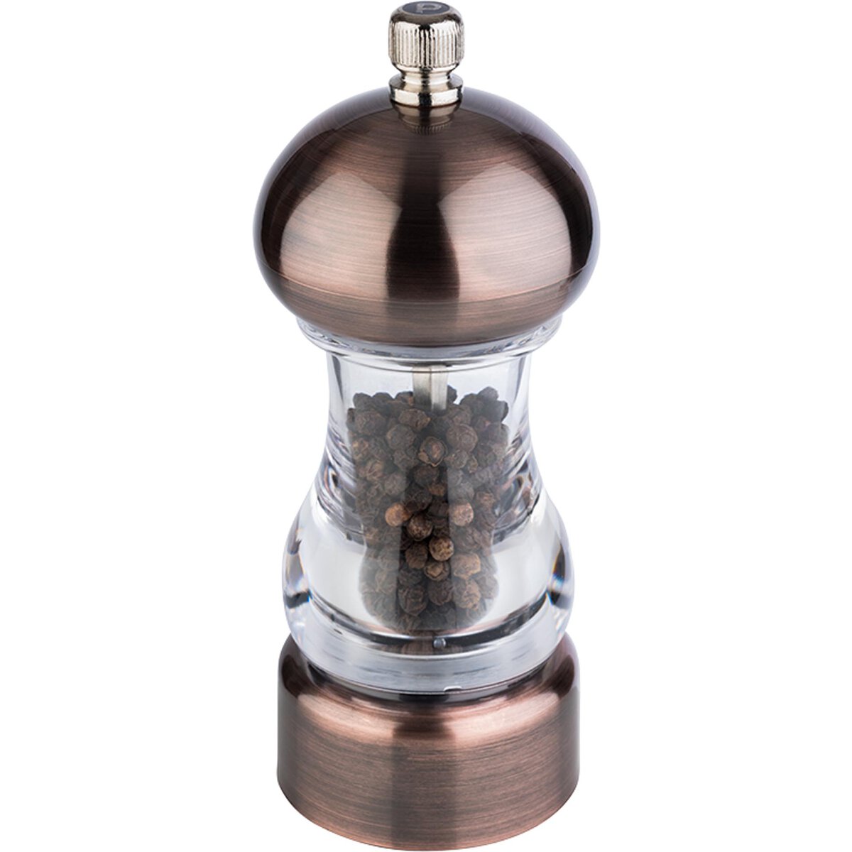 Acryl. Stufenlos einstellbarer Mahlgrad. Ø 6,0 x Höhe: 15,0 cm. Nicht spülmaschinengeeignet. Farbe: kupfer/ klar.