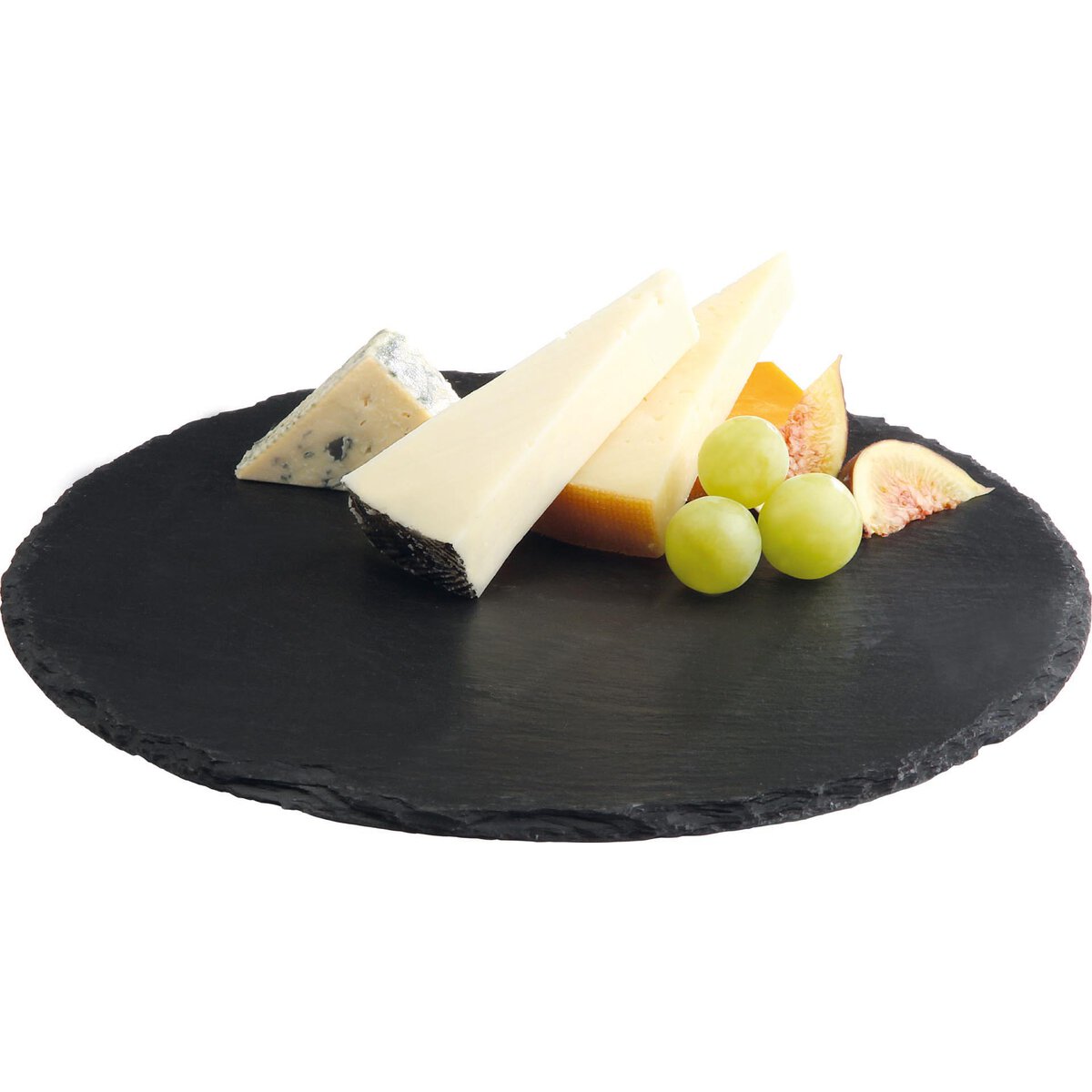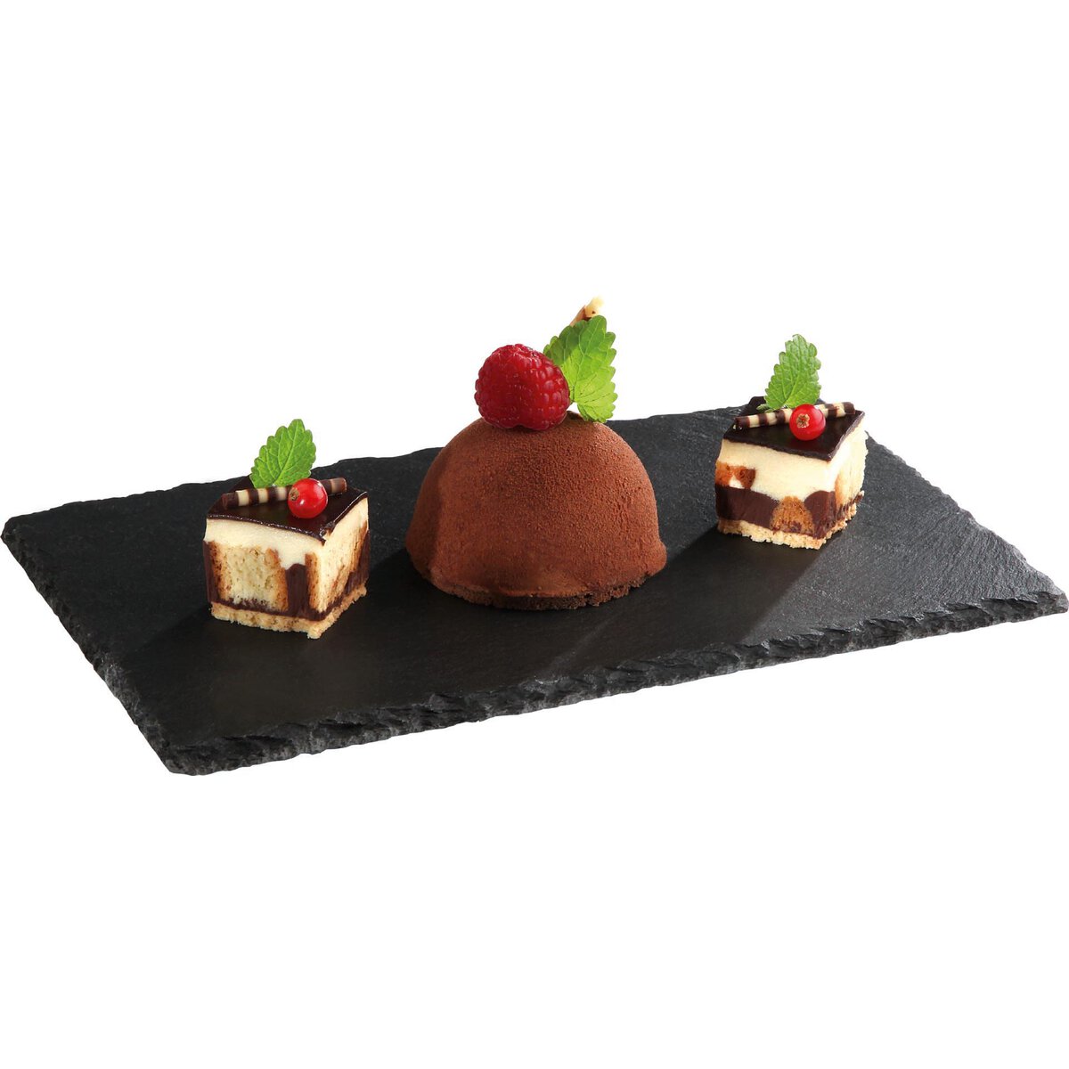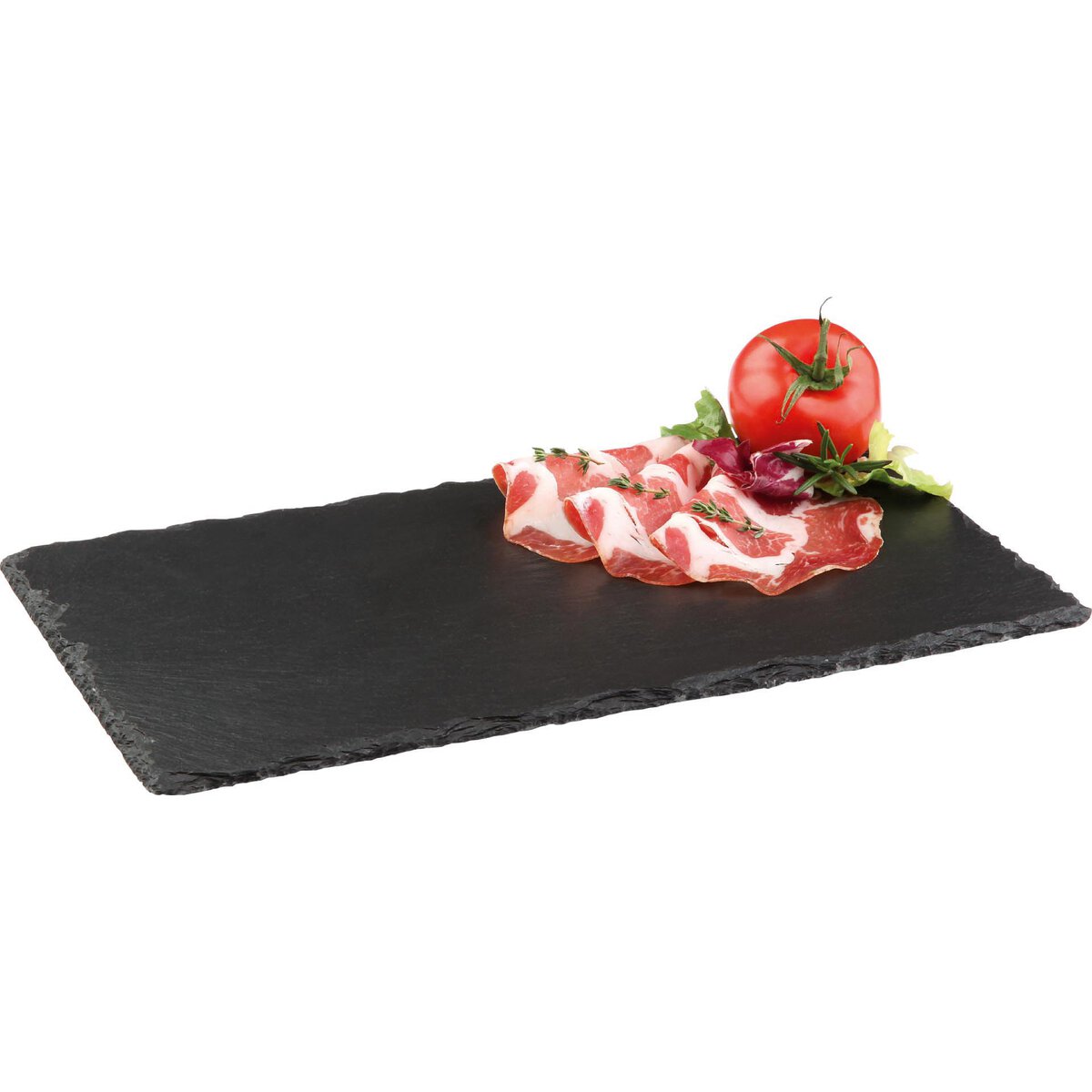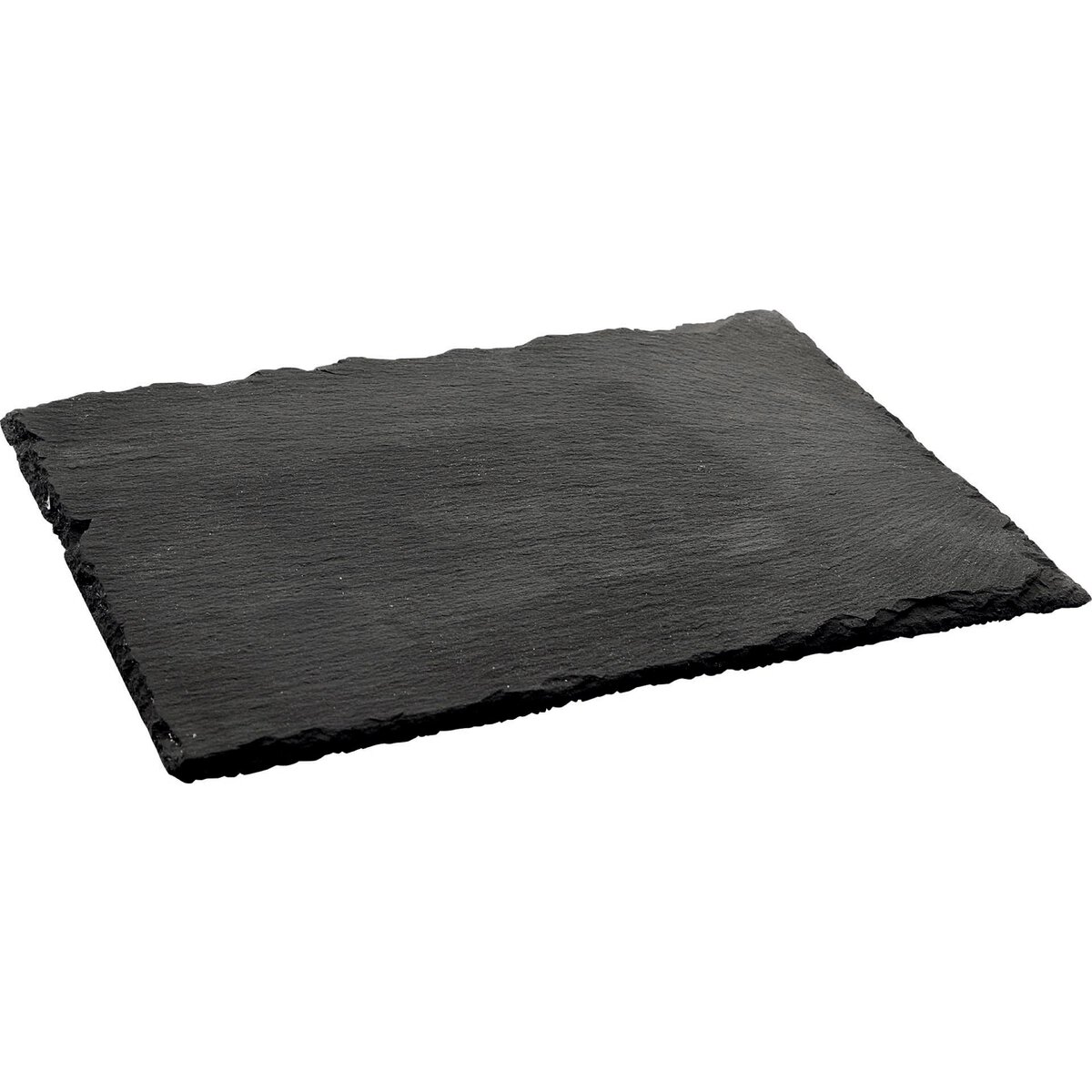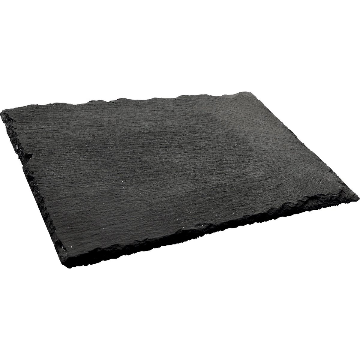 Naturschiefer. Mit Antirutsch-Füßchen. Mit lebensmittelechtem Speziallack versiegelt. Fett- und wasserdichte Oberfläche. Gebrochene Kante. Hervorragende Kältespeicherung durch Naturschiefer.