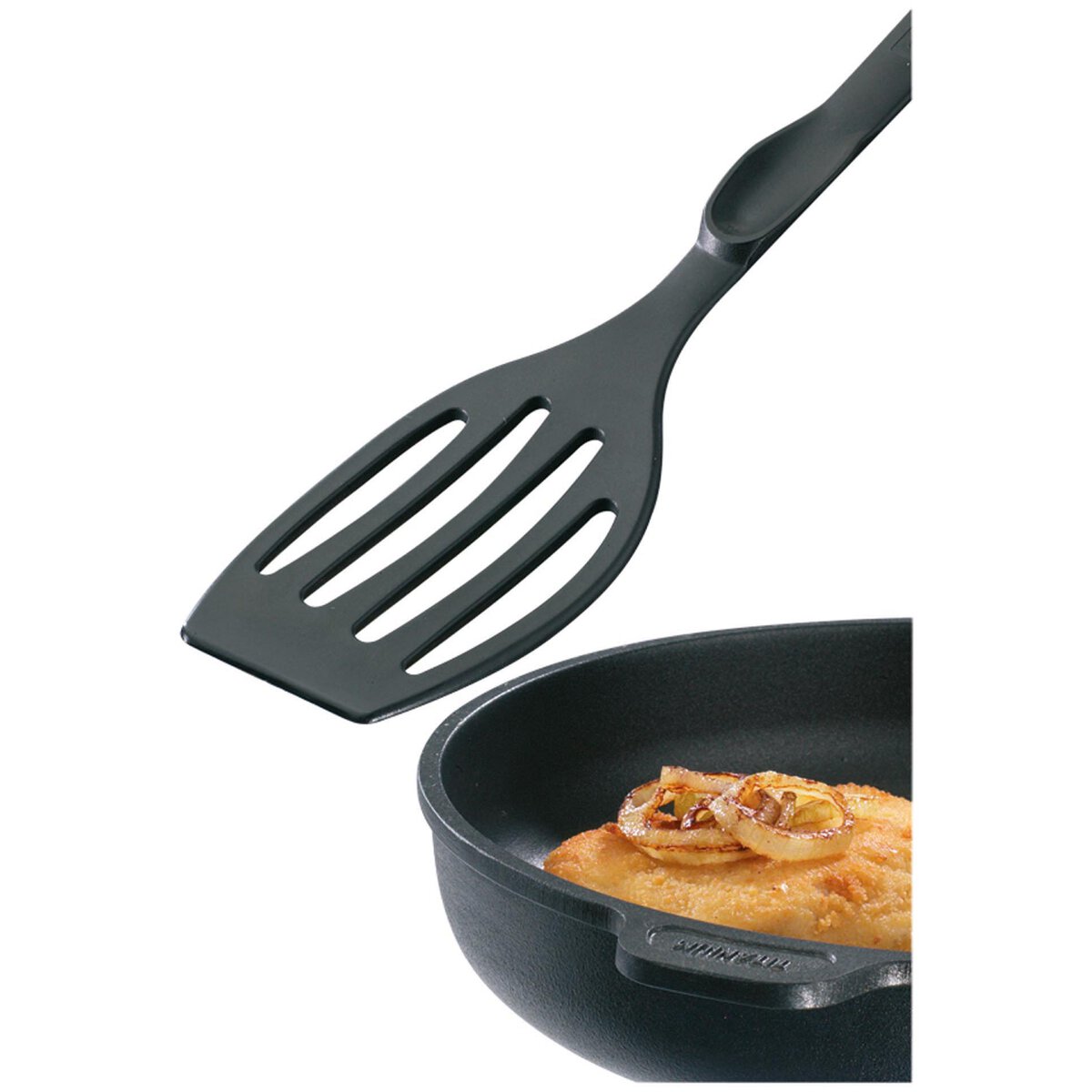 Polyamid, schwarz, hitzebeständig bis 210°C. Geschlitzt. Nicht in heißen Töpfen und Pfannen liegen lassen!