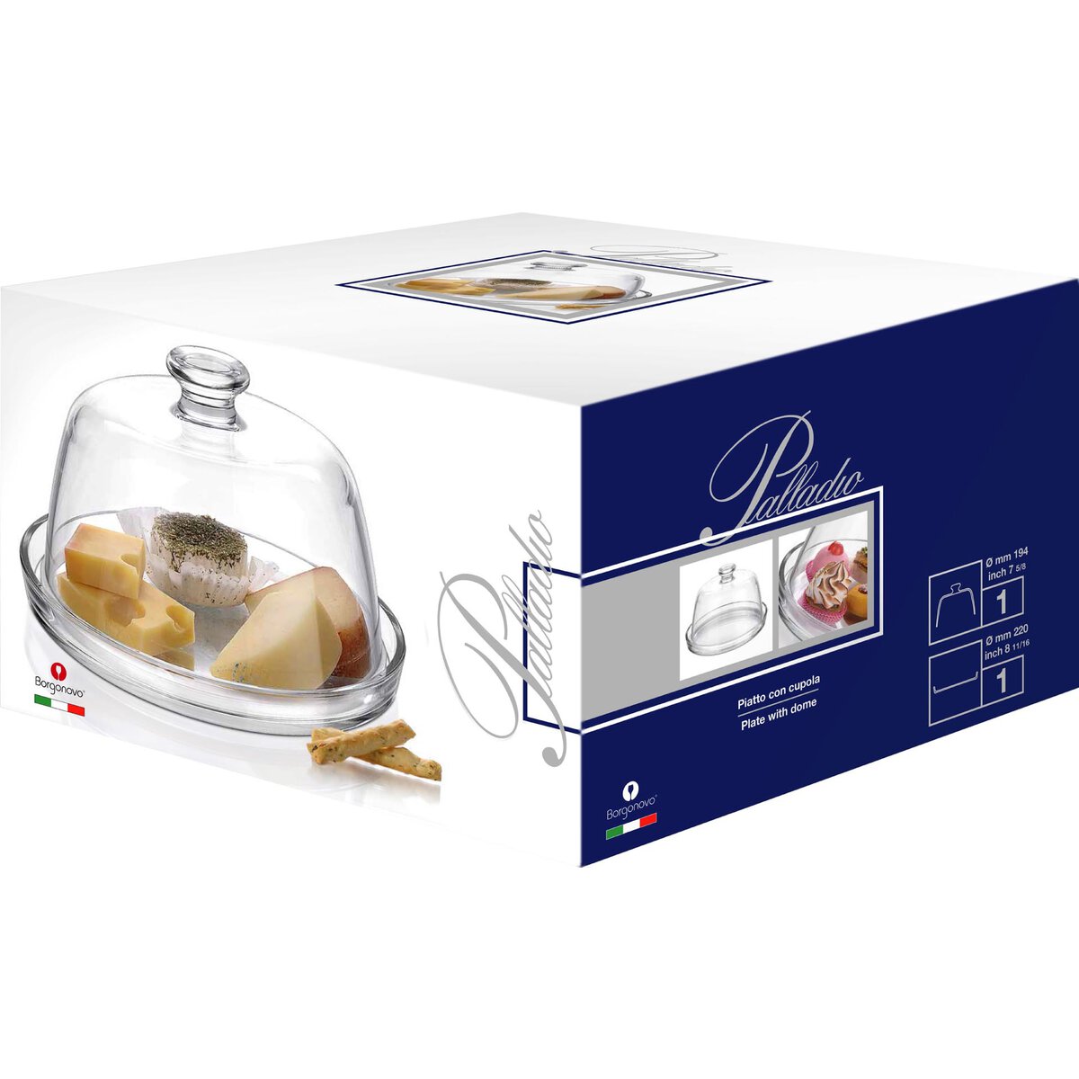 Glas. Bestehend aus Platte Ø 22cm und Cloche Ø 19,4 cm (inkl. Ring) im Geschenkkarton.