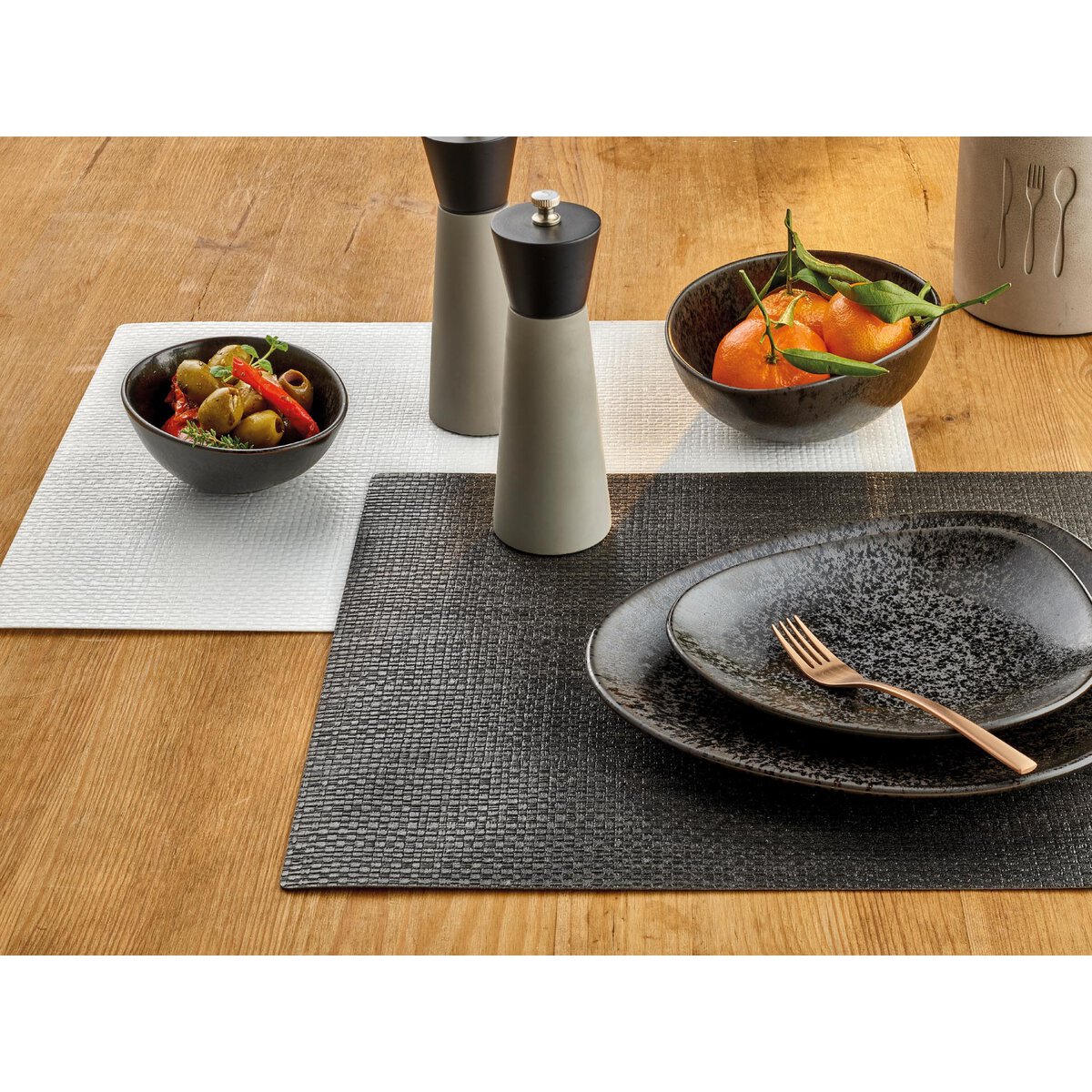 Polypropylen (lebensmittelecht), mit schön strukturierter Oberfläche, interessante Farbwirkung auf dem Tisch, da leicht durchsichtig, leicht zu reinigen, spülmaschinengeeignet.